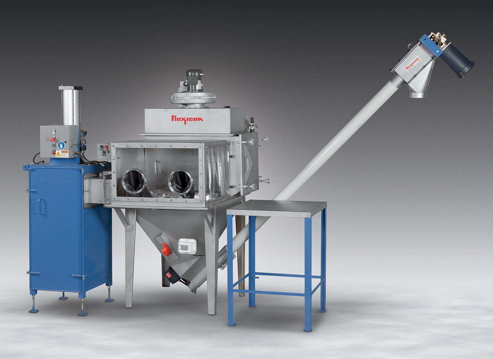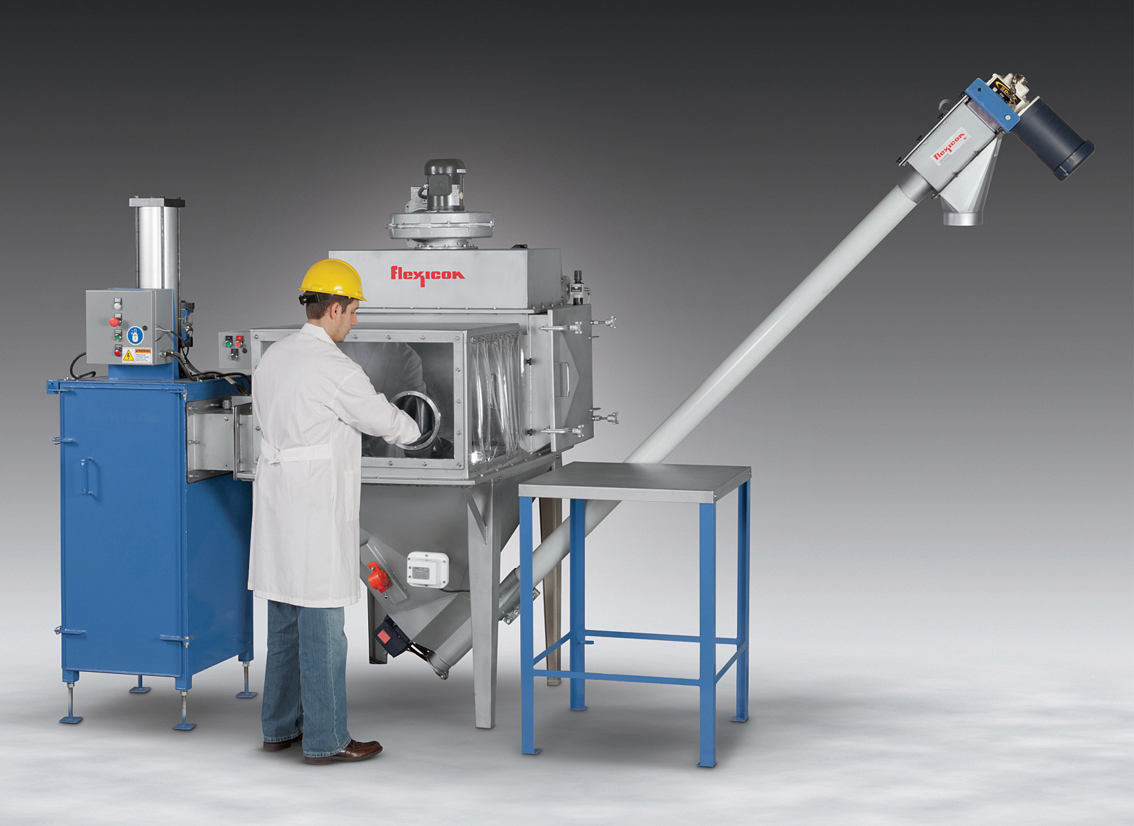 The hopper discharges into an enclosed Flexicon flexible screw conveyor for dust-free transfer of a broad variety of products including free- and non-free-flowing materials from large pellets to sub-micron powders, including products that pack, cake, seize, smear, fluidize, break apart or separate, with no separation of blended products.