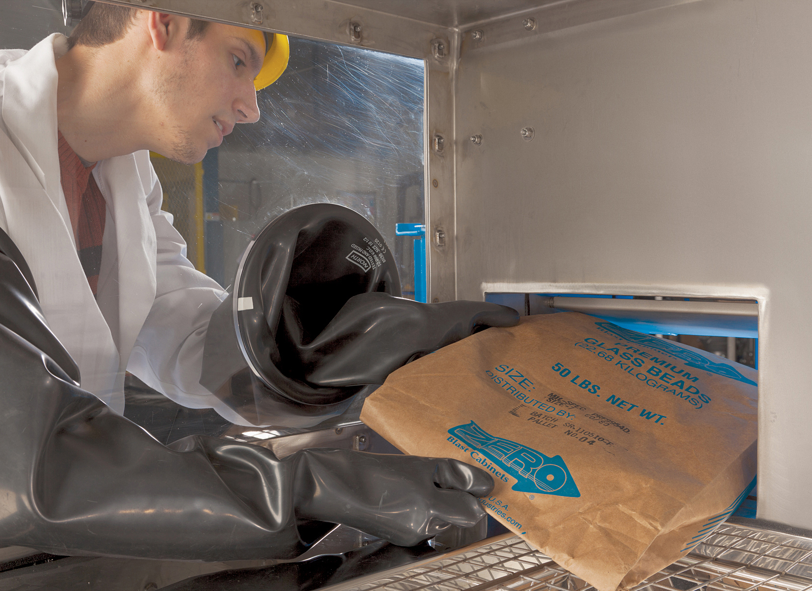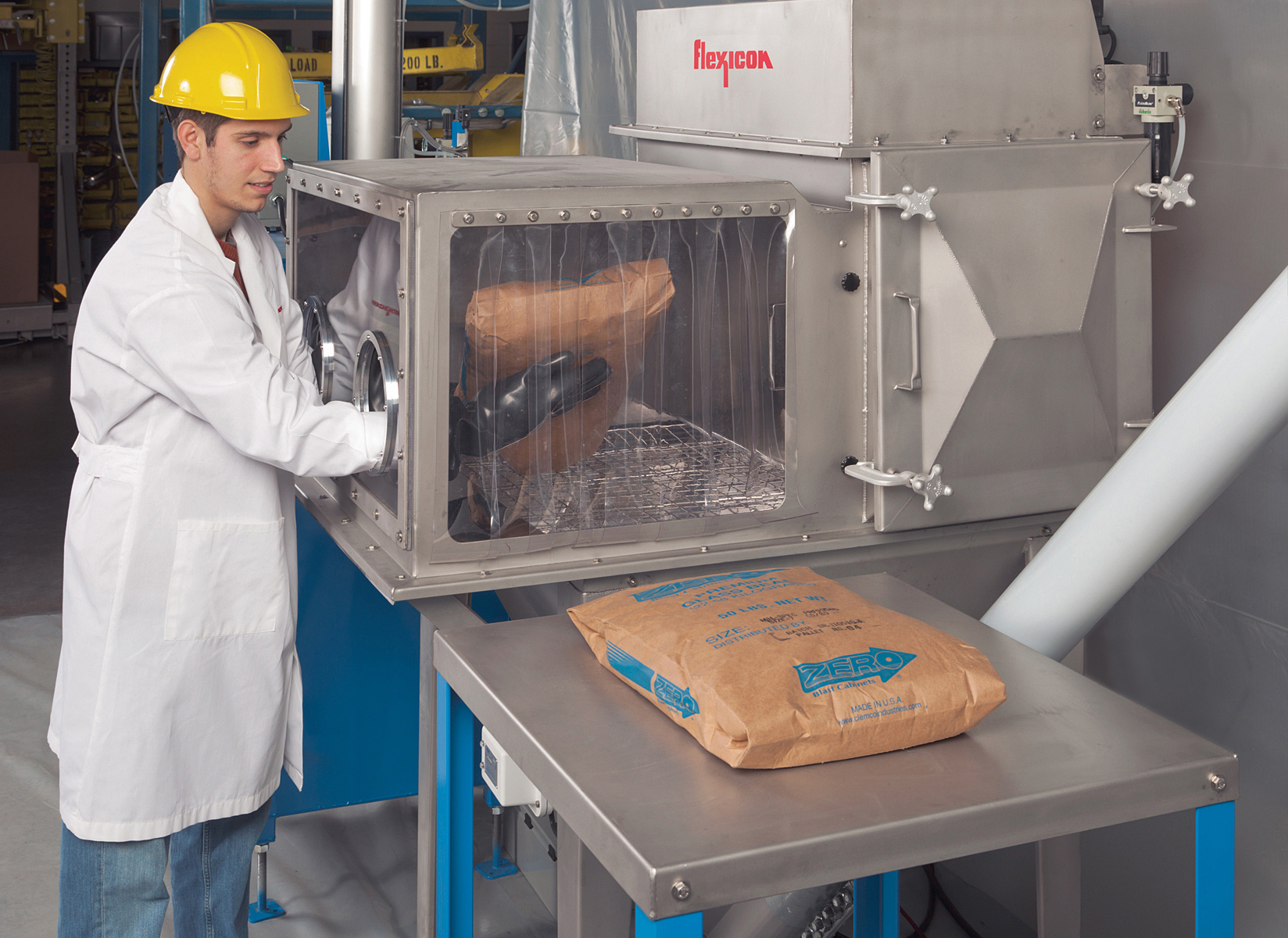 Bags are staged on a stainless steel tabletop and then transferred through a plastic strip curtain into a dumping enclosure comprised of a glove box, empty-bag chute and dust collector atop a receiving hopper.
