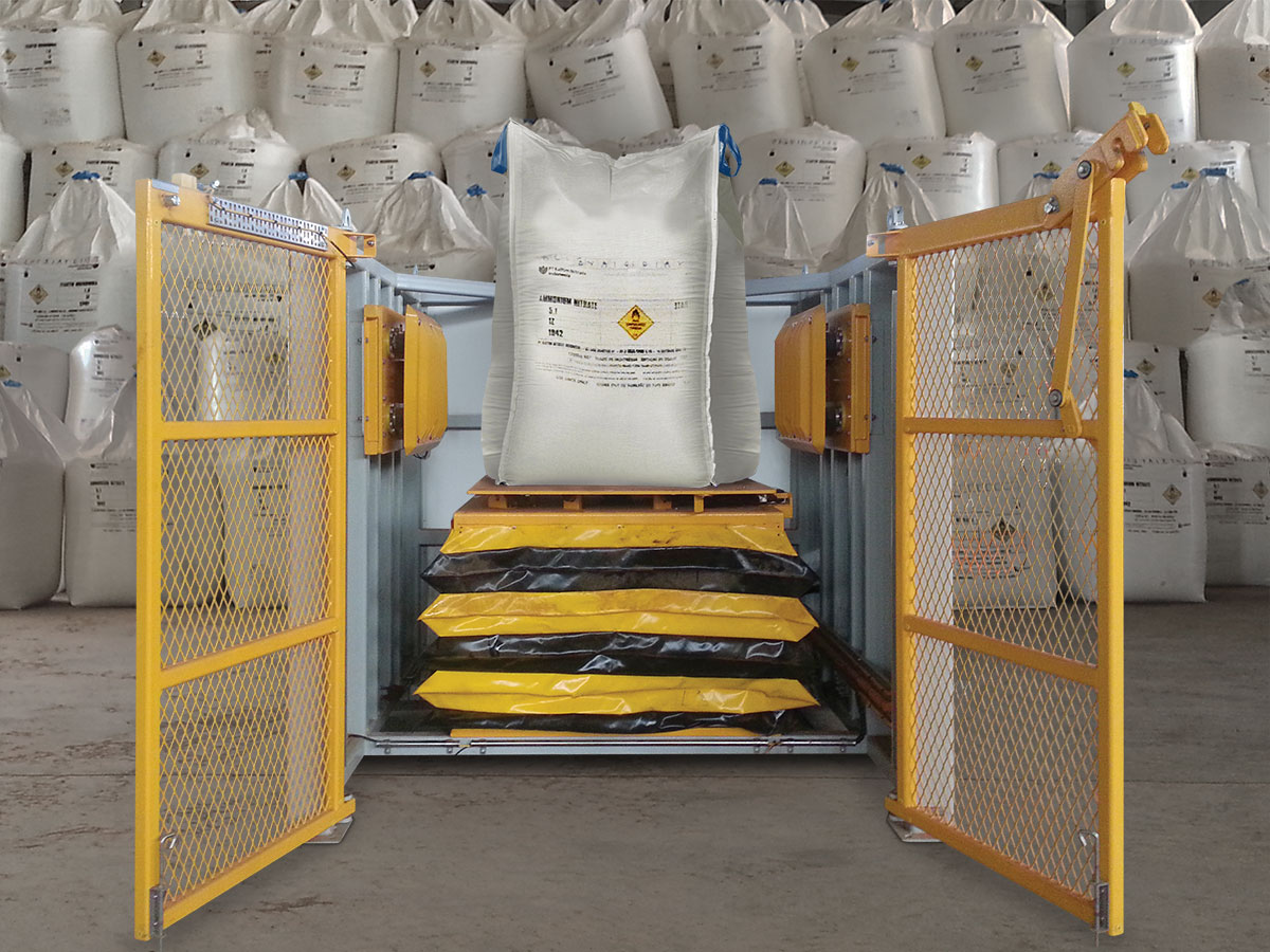 Two hydraulic rams drive contoured conditioning plates against opposite sides of the bulk bag to crush and loosen compacted mining materials, promoting flow and enabling bulk bag unloaders to discharge it through bag spouts.