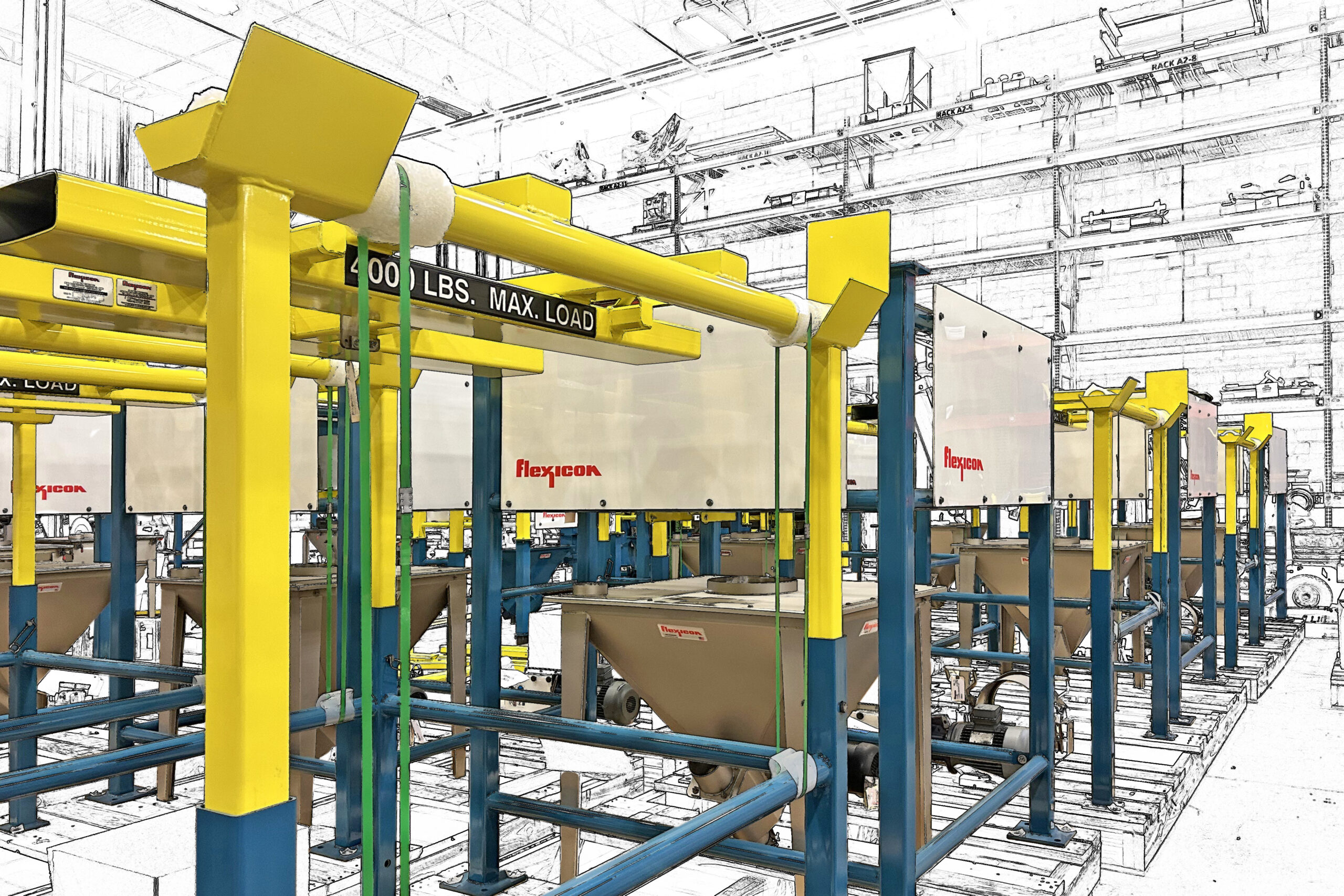 The enclosed hopper charges a Non-Flow-Through (flood feed) pick-up adapter that feeds vacuum conveyor lines.