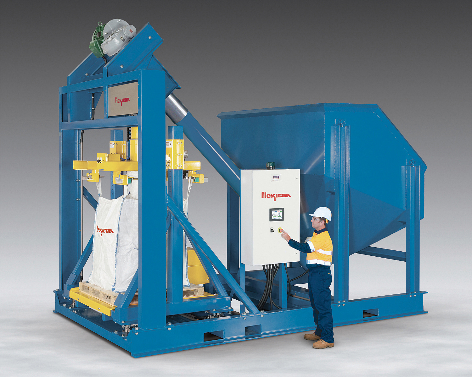 It is equipped as standard with forklift fill head height adjustment to accommodate all popular bag sizes, and a feed chute outlet port for dust-free air displacement during filling. Automated functions include an inflatable collar to seal the bag inlet spout, an inflator to remove creases from the bag prior to filling, an automated vibratory densification/deaeration system to stabilize the bag, and pneumatically retractable bag hooks that disconnect the bag from the filler, ready for removal by forklift.