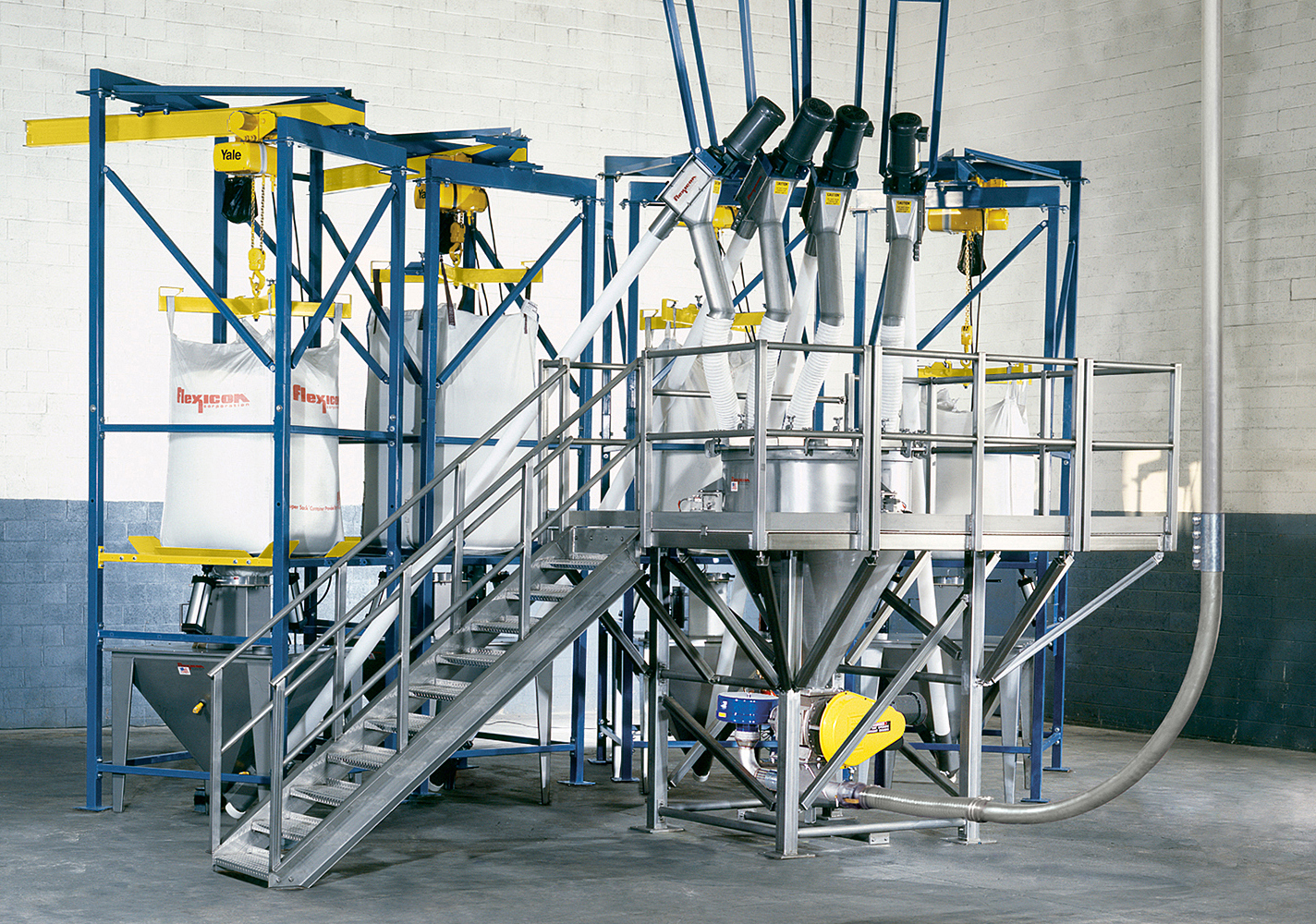 Each discharger is equipped with a surge hopper discharging into an enclosed Flexicon flexible screw conveyor. A system controller starts and stops each conveyor to weigh ingredients in sequence, first at high feed rate for rapid filling, then at dribble feed rate, stopping material flow once the accurate batch weight has been discharged. System software allows mid-batch bag changes and automatically compensates for material-in-flight by stopping the conveyor in advance of attaining final batch weights.