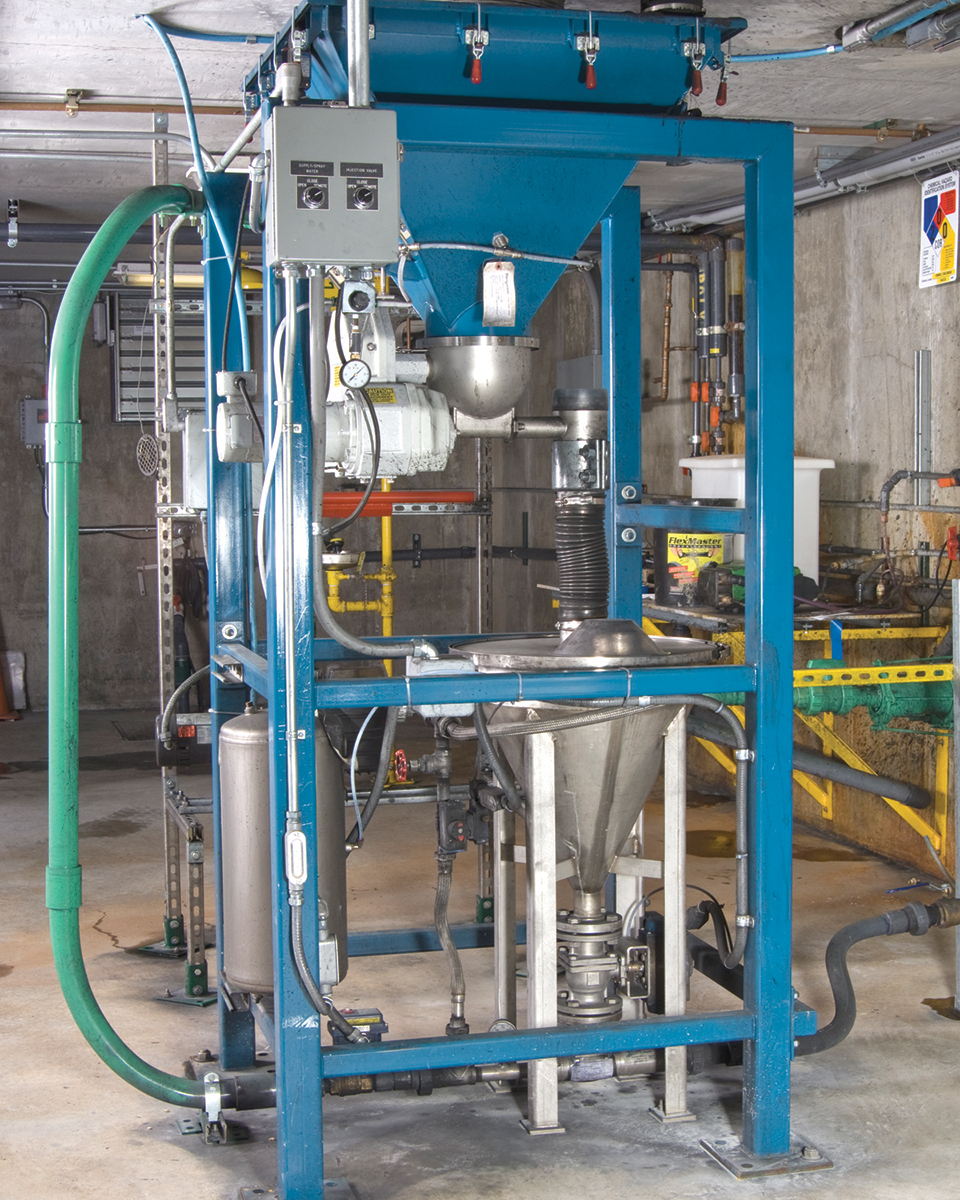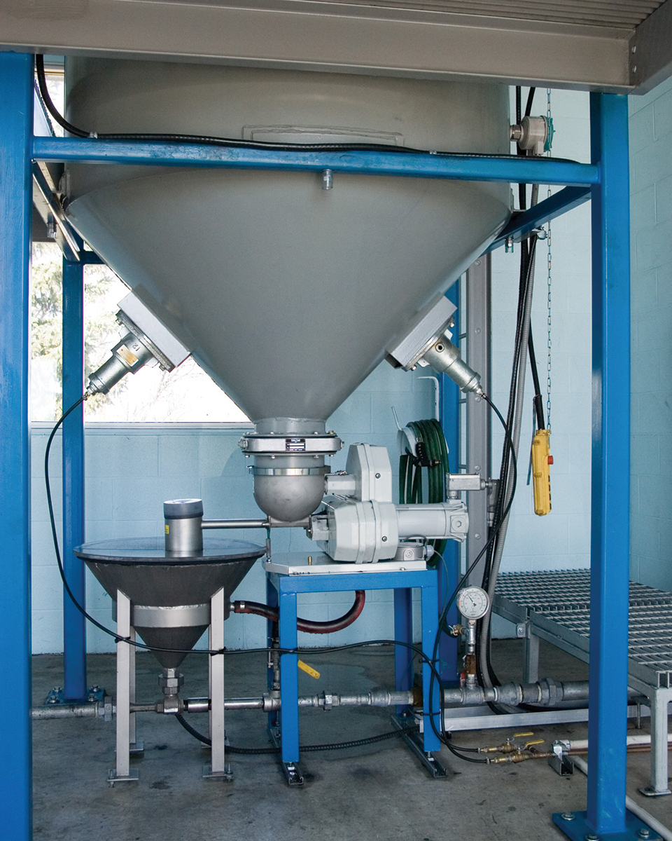 “We tried using a dust collection system, but it never worked properly,” says Holland. Also, the capacity of the system was limited by the small screw feeder, which took 16 hours to transfer the powdered carbon from the 1000 lb (450 kg) capacity hopper into the liquid slurry eductor. Since the water treatment facility operates only one shift a day — staffed for 8-1/2 hours, then unmanned and controlled by computer for 15-1/2 hours — the hopper, if not completely filled at the beginning of the unmanned shift, could potentially run out of carbon when personnel were not present to refill it.”