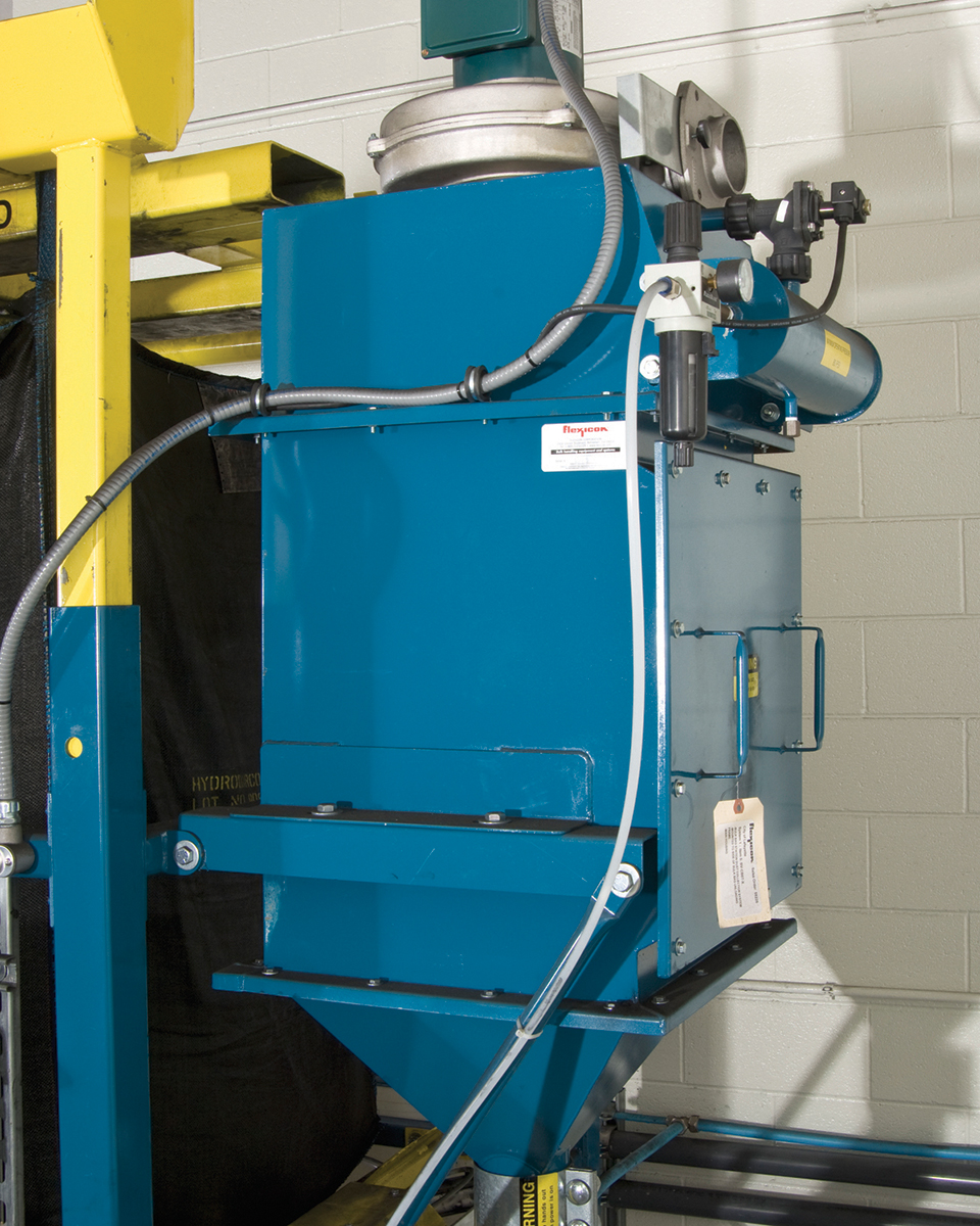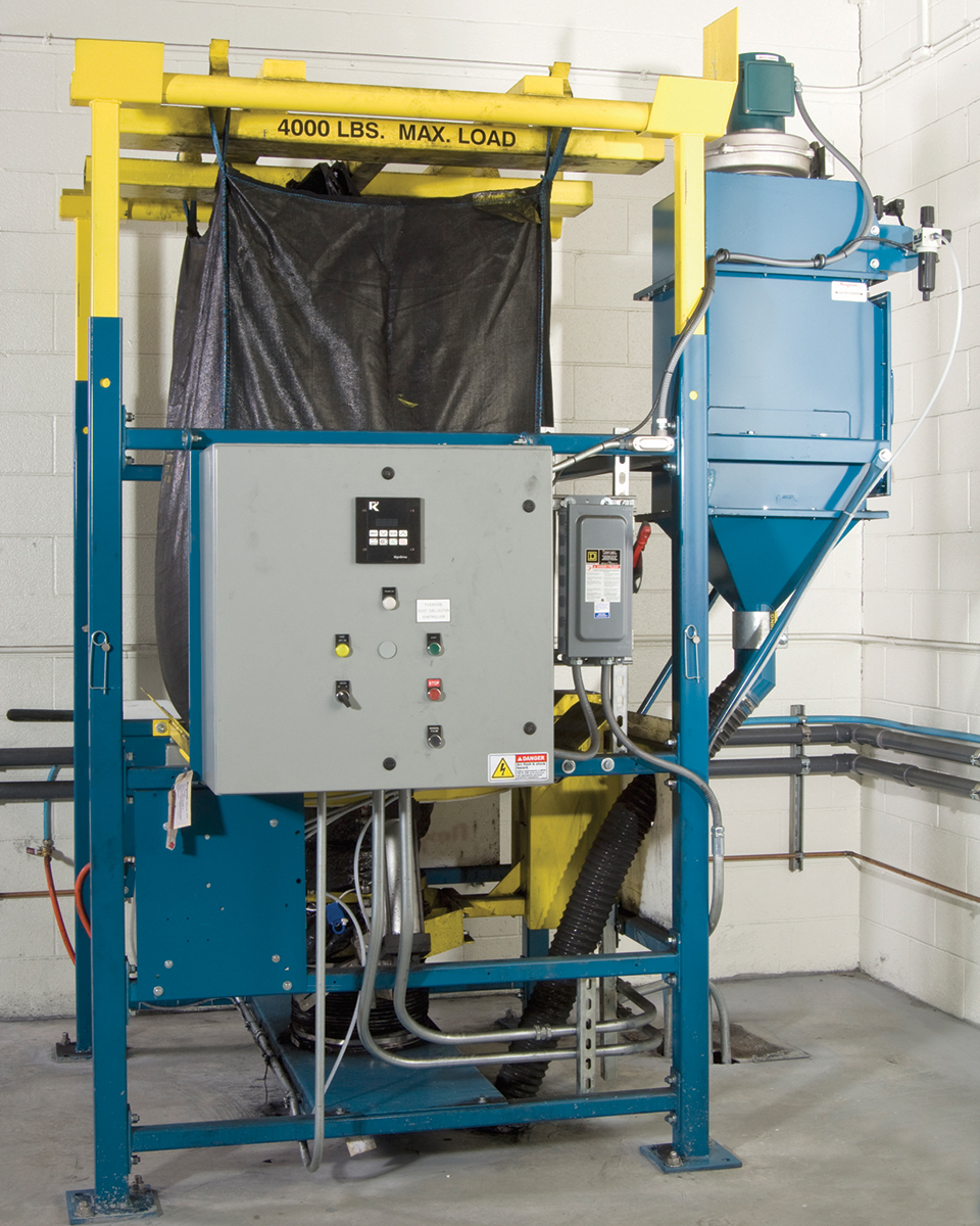 Mounted on the side of both unloading frames is a BAG-VAC® dust collector that draws displaced air and dust from a hopper vent during discharge, and collapses empty bags dust-free, ready for tie-off and removal.