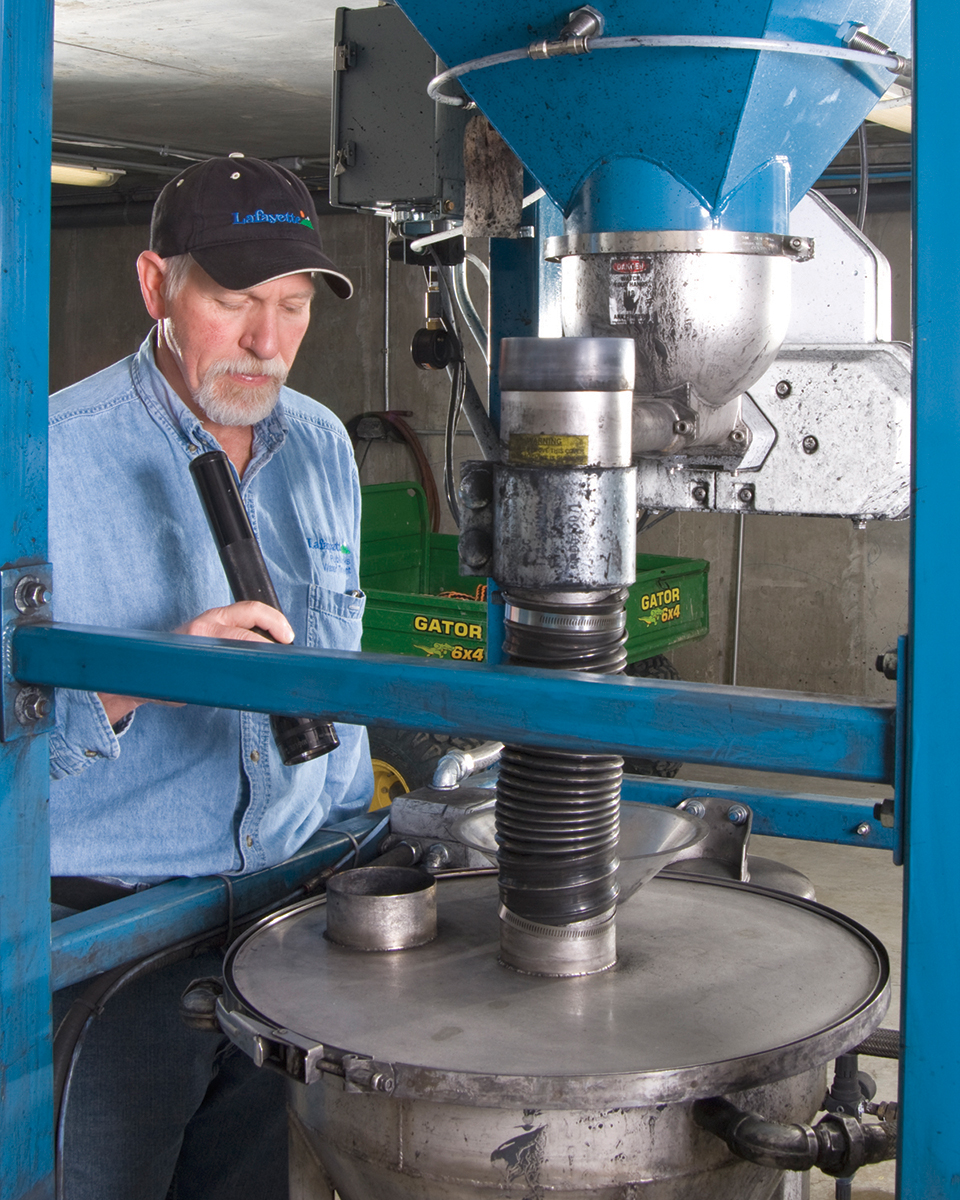City of Swift Current operators were opening and emptying as many as twenty five 45-55 lb (23-25 kg) bags of powdered activated carbon a day into the hopper. City of Lafayette operators were carrying a 35-40 lb (16-18 kg) bag of powdered carbon up a set of metal stairs and emptying it directly into the aeration and flocculation facility. “This not only created hazardous carbon dust, but since we used about 2 to 4 bags a day during the winter and as many as 10 to 17 bags a day during the summer, it also required extensive manual labor and placed operators working alone on the midnight shift in danger of falling and injuring themselves,” explains Ed Zimbleman, Lead Operator. “In addition, bags would occasionally break, requiring operators to hose down the entire area.”