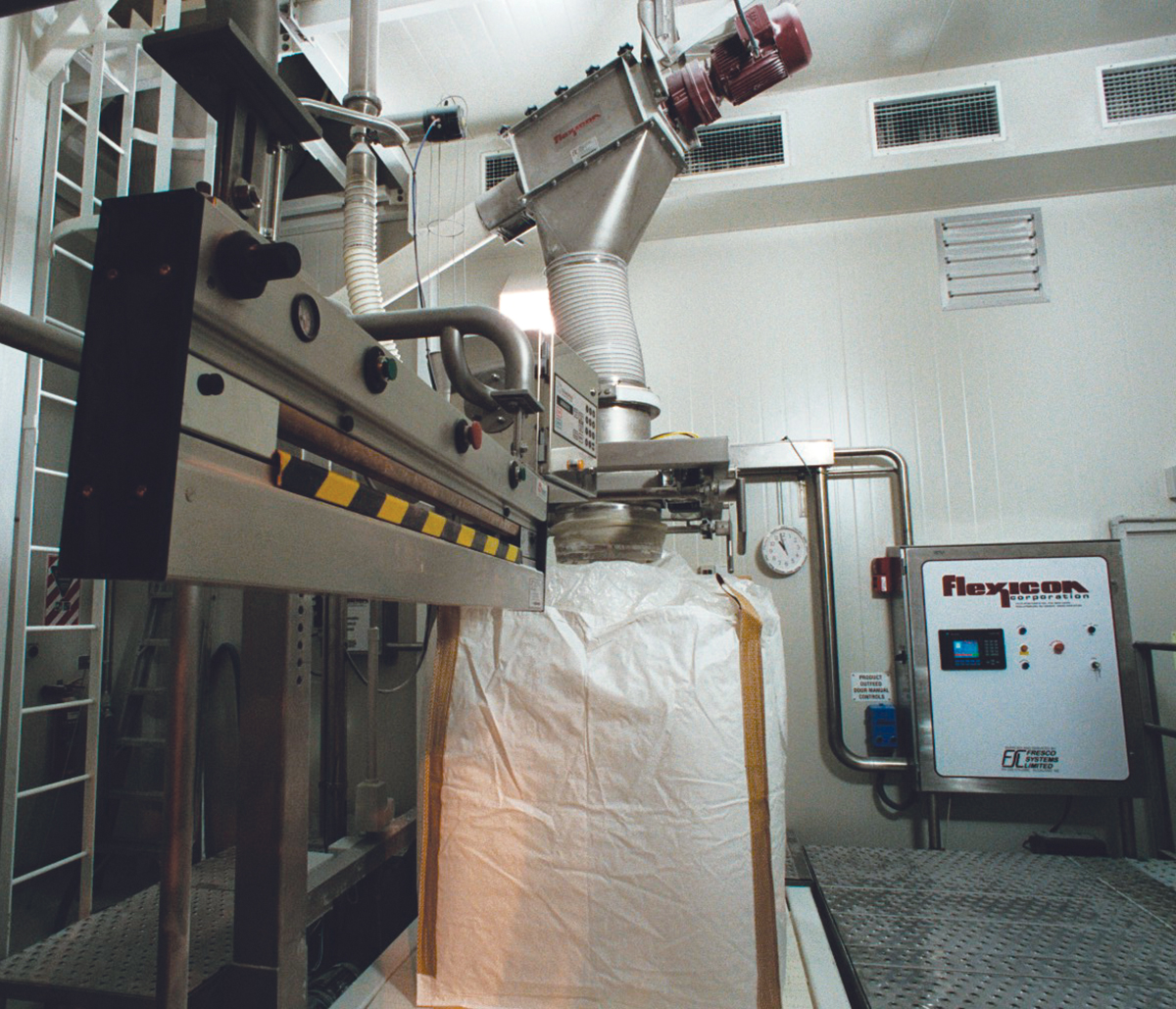 Pneumatically actuated bag strap hooks automatically release the filled bag. The PLC instructs the printer to print labels for insertion in each bag. Labels contain date, product, weight and other data for traceability and stock control. A flat-belt conveyor transfers the filled bulk bag from the filler, while a second conveyor positions the bag under a heat sealer, which seals the bulk bag liner to ensure quality of product delivered to the customer. The bag continues out of the room on the conveyor to the stacking gantry, where the bag is weighed, placed on a pallet and moved into bulk storage for stacking.
