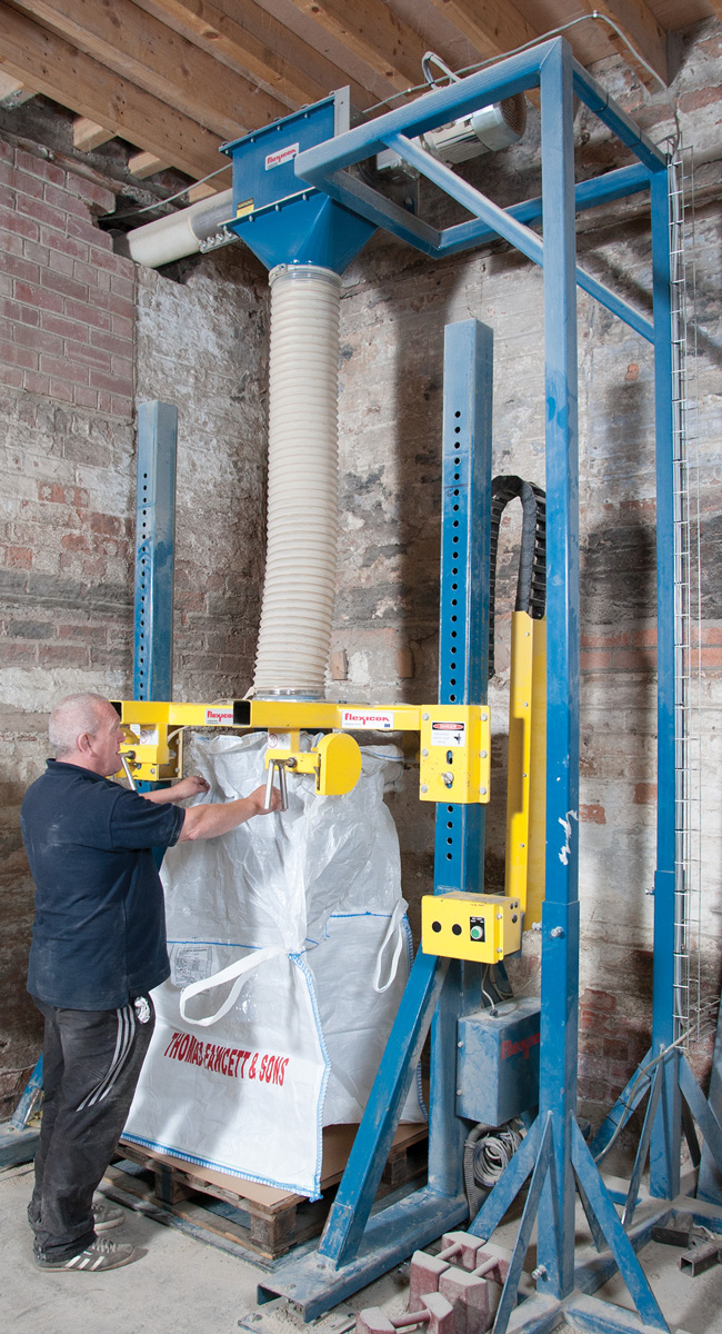 Most of the company’s malt was previously supplied in 25 tonne (27.5 ton) bulk lorry loads and 25 kg (55 lb) sacks. When the company first supplied malt in bulk bags, members of the malting staff transferred batches of malt from pre-weighed 50 kg (110 lb) sacks into bulk bags by wheeling the sacks on a sack truck on the upper floor and tipping them into a bulk bag held on a fork lift truck on the floor below. This was a three person job: one filling sacks, one tipping sacks, and one operating the forklift truck.