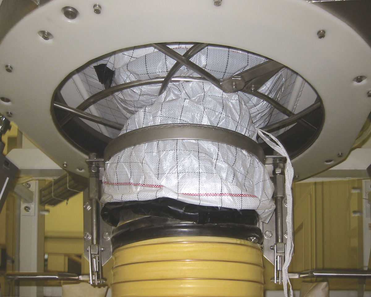 Beneath the bulk bag unloader, the stainless steel receiving hopper is equipped with a FlexiFinger device to promote flow into the flexible screw conveyor’s intake adapter. The 10 ft long (3 m) flexible screw conveyor consists of a plastic outer tube enclosing a flexible stainless steel screw — the only moving part contacting the material. The rolling action created by the self-centering screw prevents separation of ingredients having disparate bulk densities, particle sizes and shapes.