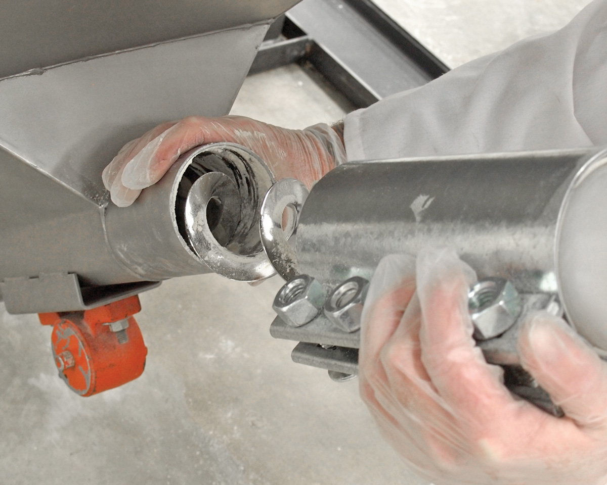 A removable clean-out cap at the intake end of the conveyor tube permits rapid emptying and flushing of the tube as well as disassembly and wash-down of components. “The system does not require cleaning during short runs,” says Shapiro. “For longer runs, we disassemble and sanitize the system at least once a week.”