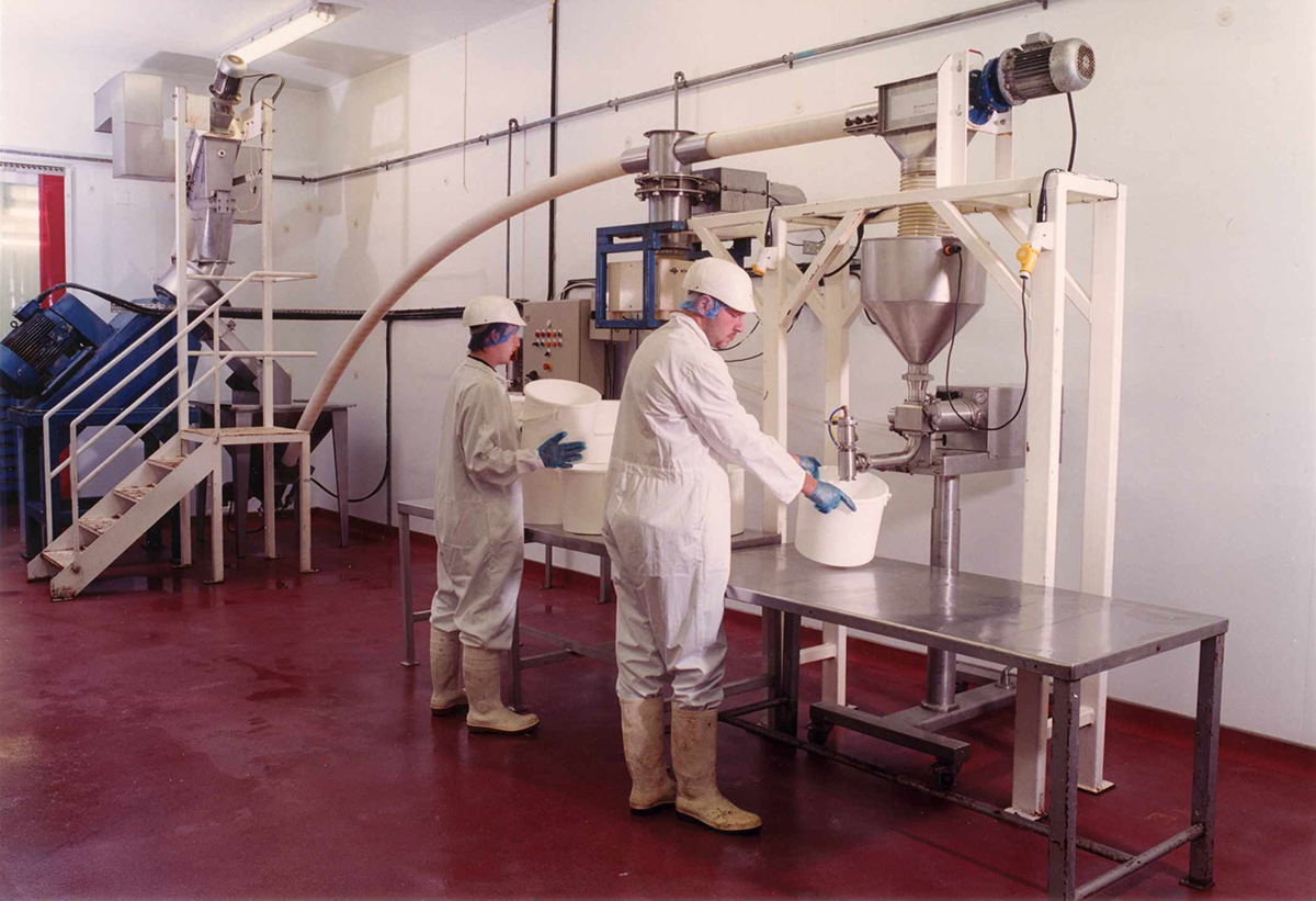 Two operators weighed and packaged the buckets for shipment to food processors such as Sharwoods, Nestlé and McCormicks. Another operator washed down and prepared the system, and two more operators carried out general duties and delivery. Weekly output was limited to 5 tons.