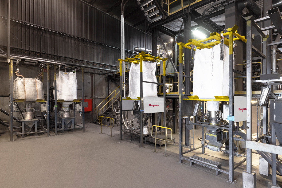 After processing, another set of flexible screw conveyors, ranging from 4 to 8 metres (13 to 26 ft), transfers the materials to the bins above the bulk bag filling stations.