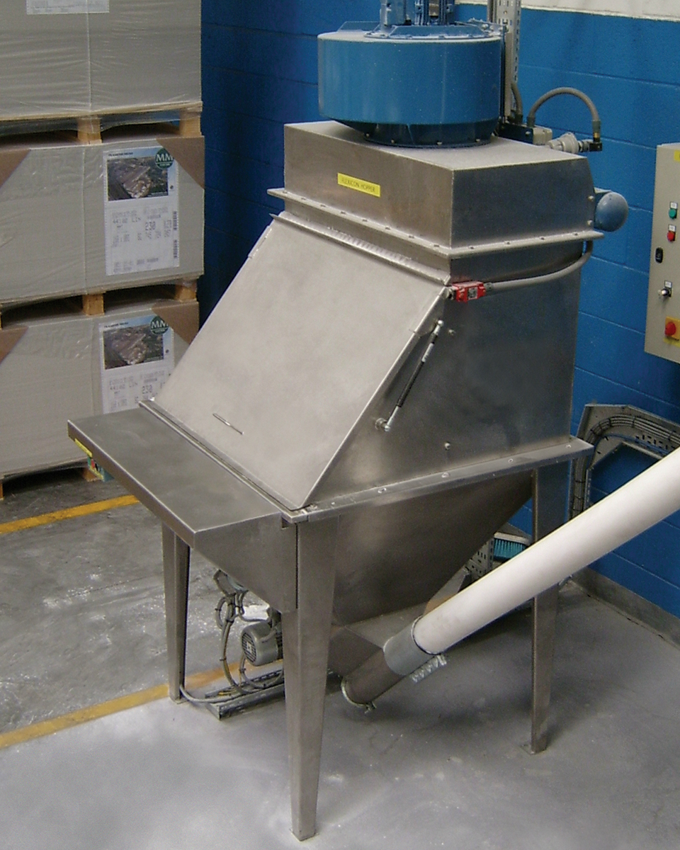 While still requiring an operator to manually handle ten bags of starch per batch, the bulk handling solution greatly minimizes operator involvement and streamlines material flow. Operators lift bags at ground level and split and dump contents via a bag support tray into a 9 cubic foot (250l) T-36 receiving hopper. Material first passes through a 2 in (50 mm) mesh screen to prevent foreign particles, such as paper fragments, from entering the process stream.