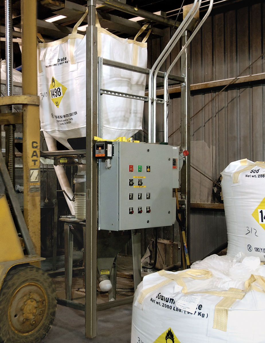 Each batch consumes 10,000 lb (4,535 kg) of sodium nitrate supplied in five 2,000 lb (907 kg) bulk bags, which are emptied using a bulk bag unloader manufactured by Flexicon Corporation, Bethlehem, PA. The unloader has a removable bag-lifting frame that connects to straps on the bulk bag, and is hoisted by forklift into a cradle at the top of the unloader frame. As the bag empties and elongates, POP-TOP™ bag extension devices mounted on the top of the frame stretch the bag into a cone shape, promoting total discharge of material from the bag into the hopper.