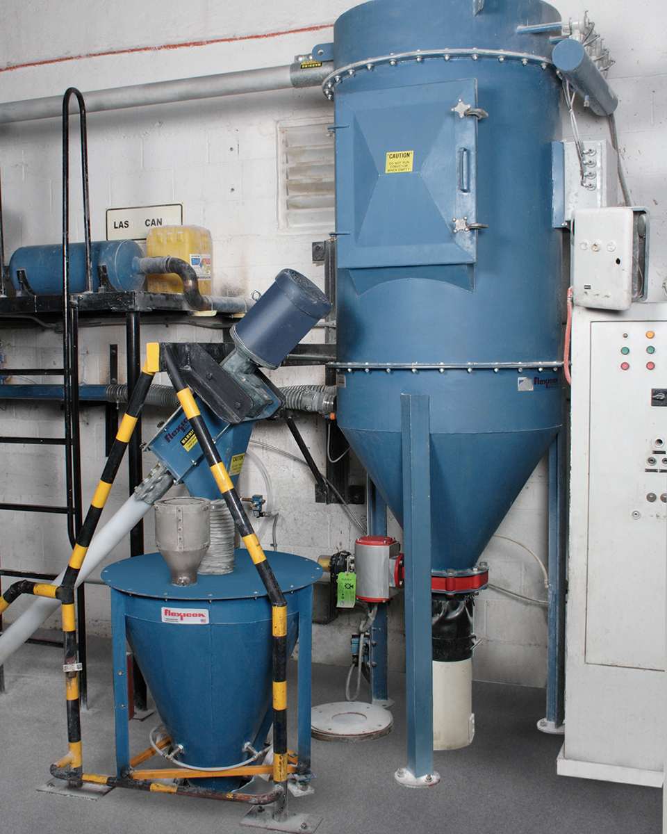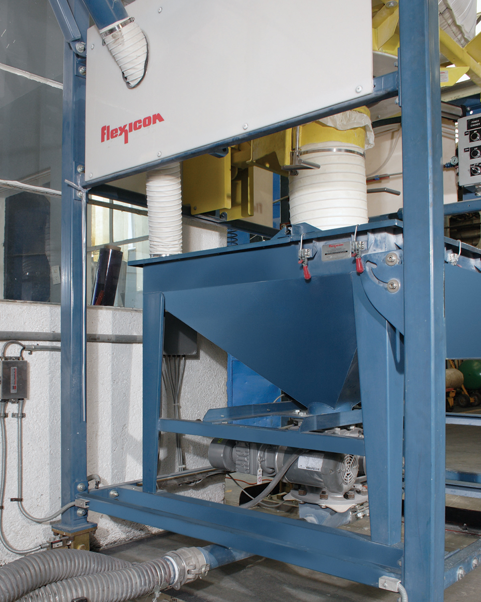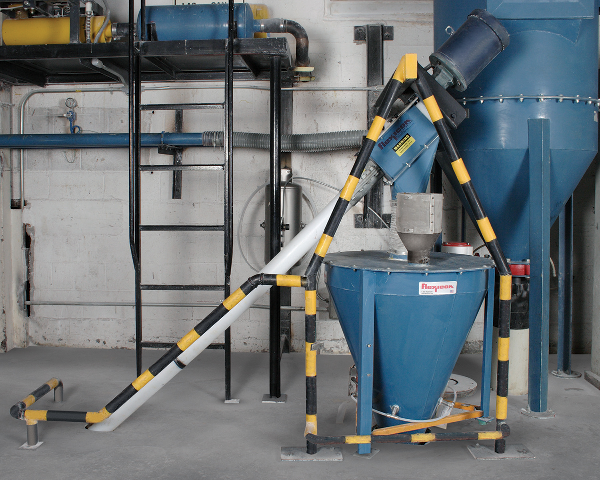 Oplex is in an old building with little horizontal space, so operations are spread over several floors. A vacuum pneumatic system conveys PVC resin from bulk bags to a filter receiver on the third floor of the plant. A hopper integral to the bulk bag discharger directs PVC resin to a drop-through rotary valve, which meters the material into one of two 3 in. (7.6 cm) diameter pneumatic conveying lines transporting it 200 ft (60 m) to the 36 in. (91.4 cm) diameter filter receiver above the mixer. The bulk bag discharger is equipped with load cells to allow the PLC to receive loss of weight data as material is conveyed from the discharger. This enables the PLC to control the feed of the pneumatic conveyor so that the required weight of PVC resin is delivered to the filter receiver and then dropped through a chute to the mixer. The two separate pneumatic conveying lines prevent cross contamination when running different products.