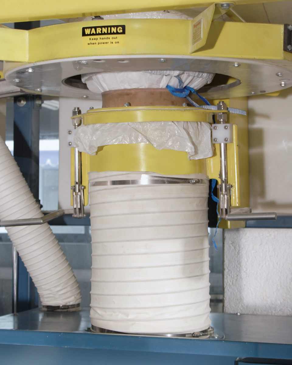 PVC resin flows from the bag through a TELE-TUBE® telescoping tube that attaches manually to the bag spout with a SPOUT-LOCK® clamp ring, which creates a dust-tight connection. The tube pneumatically raises and lowers, applying continuous downward tension to elongate the bag and keep the spout taut, which prevents the spout from bulging outward (creating dead pockets) or falling inward (creating flow restrictions), for complete evacuation. A bin vent dust collector mounted on the discharger frame also keeps dust from escaping into the plant. This not only helps to safeguard worker health by reducing airborne particles, but improves plant cleanliness and reduces the risk of product contamination from tramp particles.