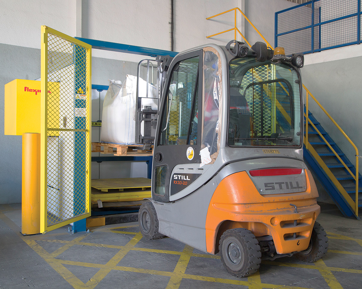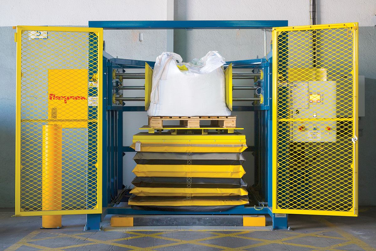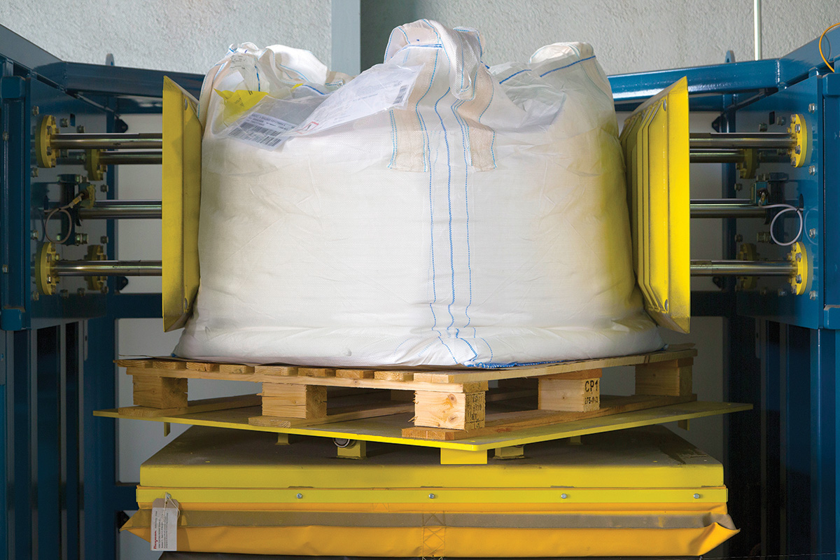 Once a forklift loads a bulk bag onto the conditioner’s platform, the operator closes the safety interlocked doors.