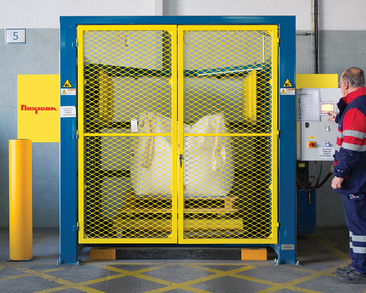 Workers originally emptied the bag onto a grate in a caged area and proceeded to crush the lumps using hand tools. “These manual methods created significant time loss and disturbances in the loading process while posing risk of injury and discomfort to workers,” says Elio Sanchez, Project Manager at DSM Coating Resins Spain. And DSM still encountered blockages in the downstream process, further slowing production.