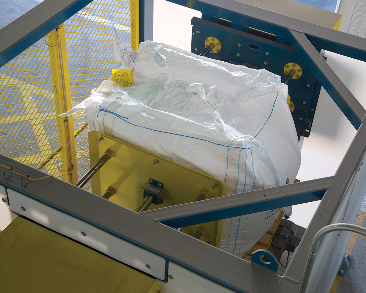Manufactured by Flexicon (Europe) Ltd., the Bulk Bag Conditioner is installed in a safe atmospheric area near the front end of the process, which feeds the factory’s blending reactors.