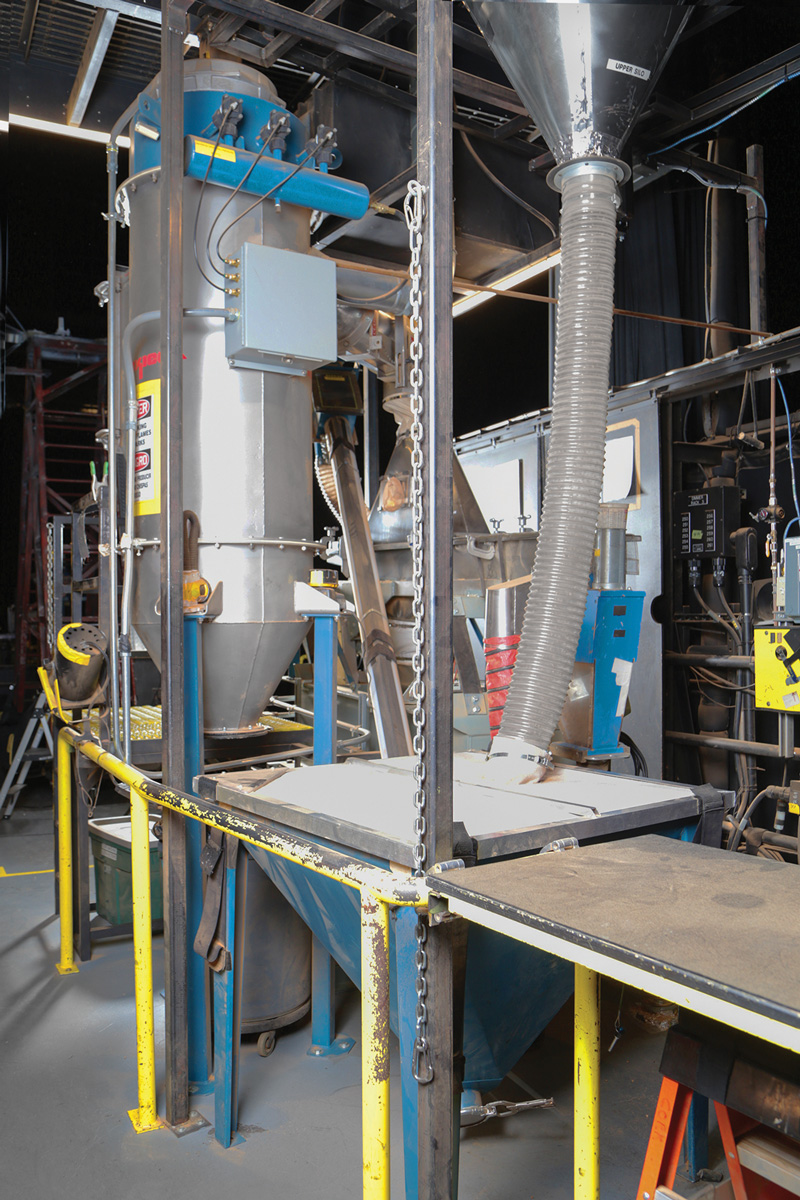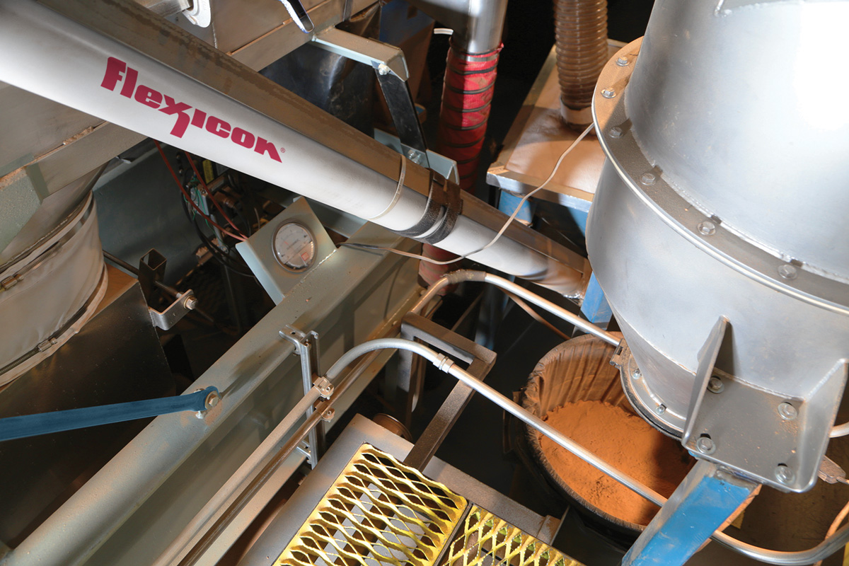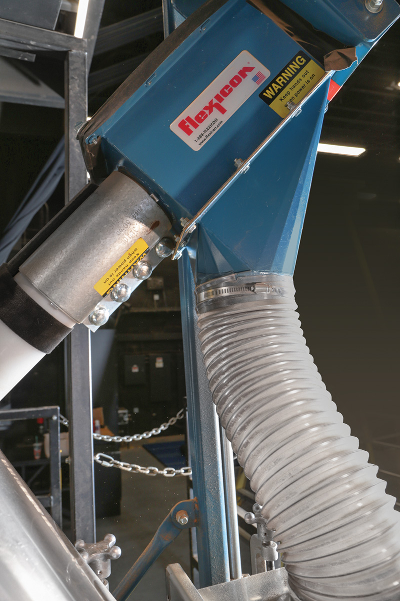 The material then flows into the 5 cu ft (142 L) surge hopper of a 10 ft (3 m) long Flexicon flexible screw conveyor. A shaftless screw rotating within a 4.5 in. (114 mm) polymer tube inclined at 45 degrees, serves to both elevate the material and feed it volumetrically into a vibratory size classifier/separator. The amount of material continuously fed into the separator can be fine-tuned by infinitely variable adjustment of the conveyor screw RPM.