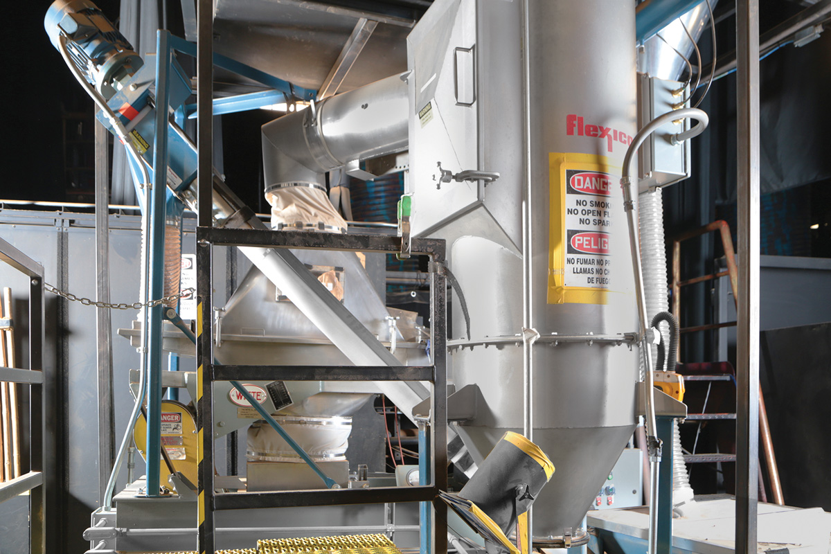 Cork dust is separated from on-size particles by an upward flowing airstream produced by a fan below the separator’s perforated deck, and a Flexicon filter receiver above the deck. Cork dust collected on outer surfaces of the receiver’s filter material is periodically dislodged by short blasts of compressed air, causing it to collect in the lower section of the cylindrical dust collector’s enclosure, which is emptied through an 8 in. (200 mm) manual gate valve at the enclosure’s outlet.
