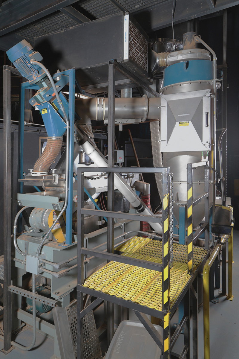 The machine is inspected and cleaned after each use, and the entire system is dismantled and cleaned annually. The filter-receiver’s seven filter bags slip over steel cages, allowing easy removal. When required, the filter bags are simply laundered in a washing machine.