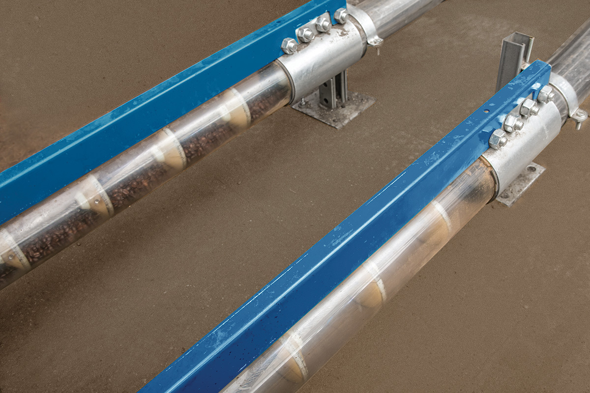 A 3 ft (914 mm) section of stainless tubing immediately downstream of the material intake is substituted with a transparent section of plastic tubing, allowing operators to visually monitor performance of the system, including fill levels of the “pockets” between discs.