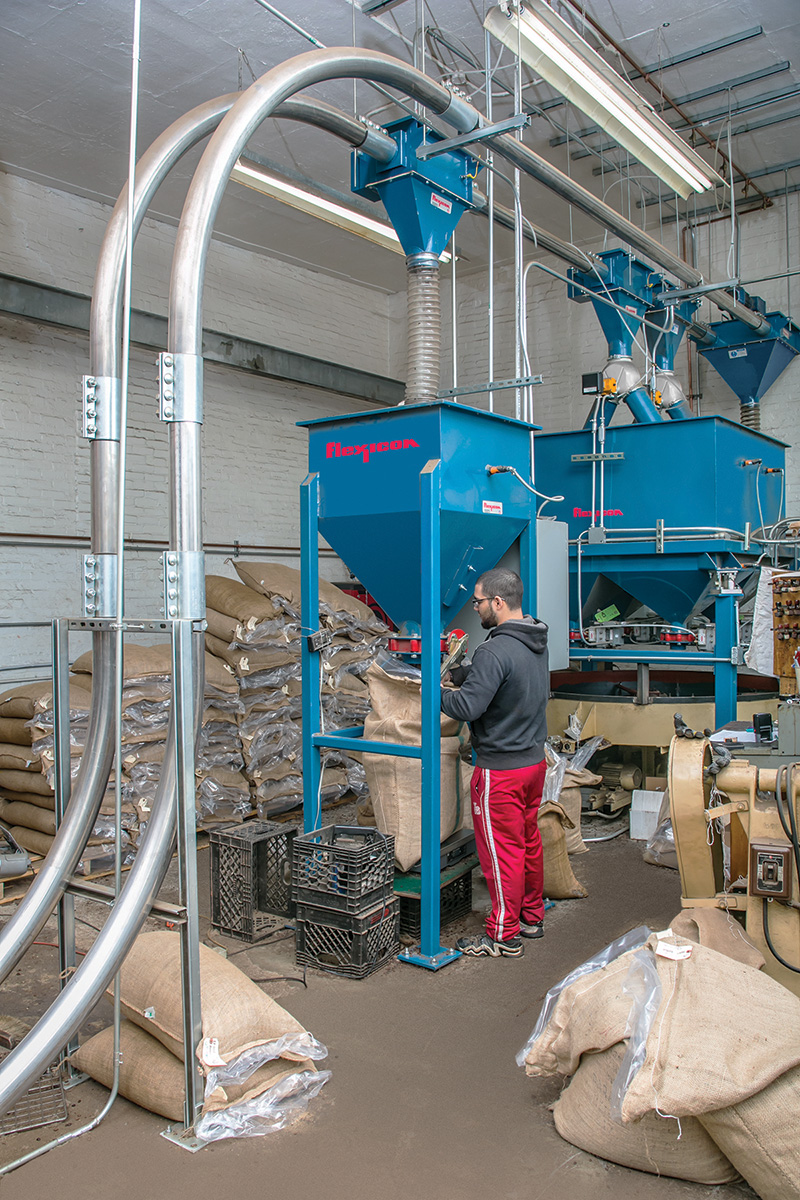 Porto Rico receives green beans in bulk bags that are unloaded from a discharge station and hopper (both supplied by a different vendor). The beans are manually weighed and transferred in batches up to 150 lb (68 kg) by a pneumatic conveyor into a roaster.