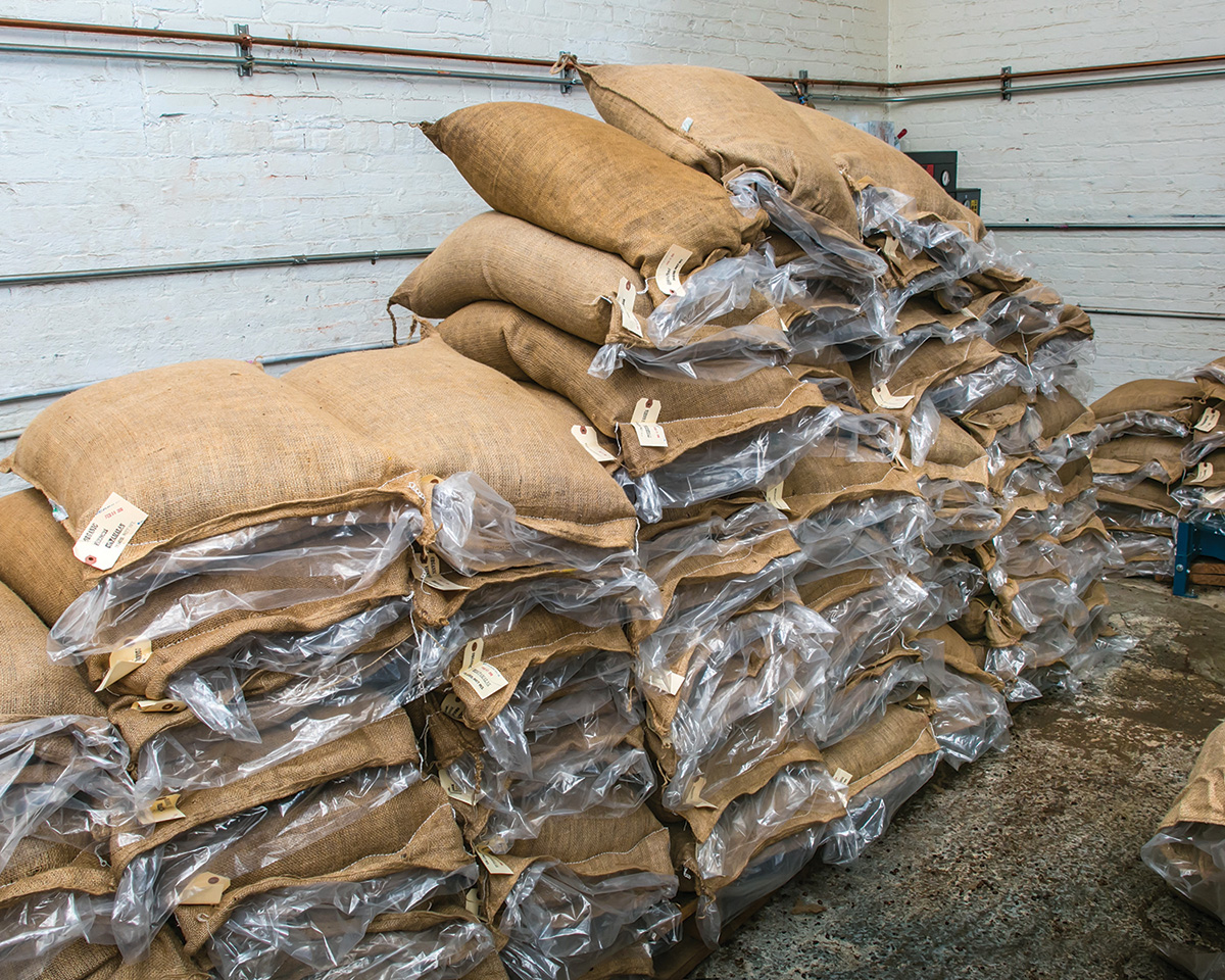 Porto Rico roasts, blends, grinds and packages beans in its new Brooklyn roasting facility. Operations follow a strict schedule. This includes roasting up to 150 lb (68 kg) of beans at a time, generating dozens of blends for wholesale and retail purchasers, grinding and degassing some coffee, and loading products into 25 and 50 lb (11 and 22 kg) burlap sacks for shipping.