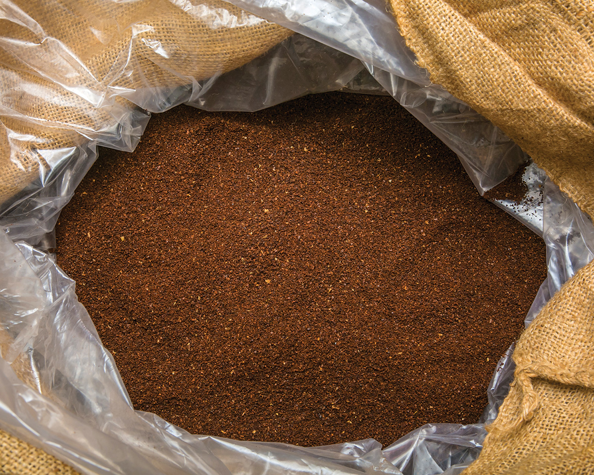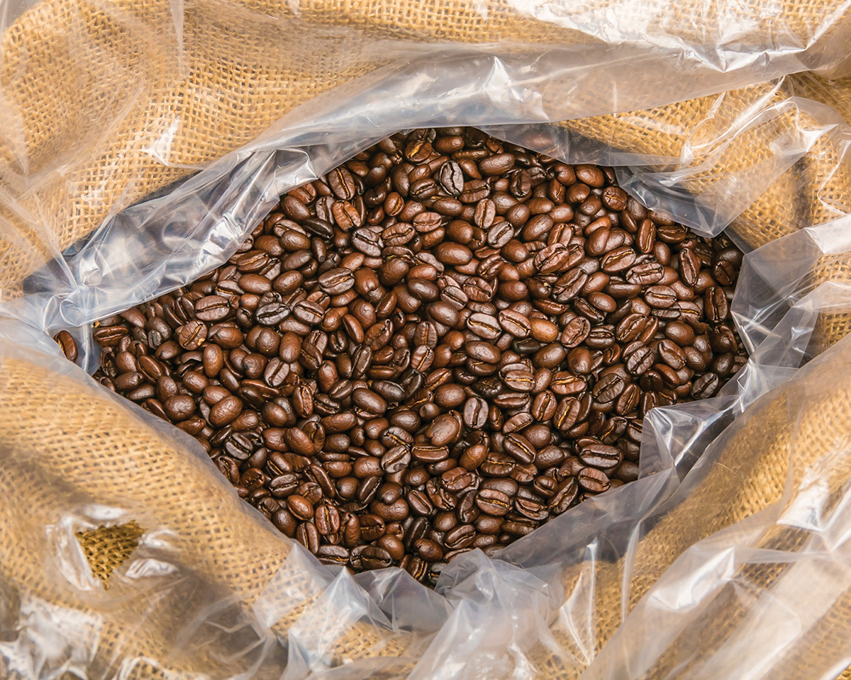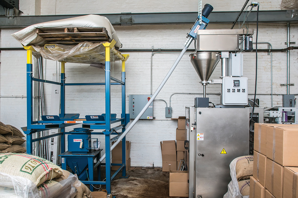 From the grinder, a portable flexible screw conveyor, 10 ft (3 m) long, transfers ground coffee at a 45 degree angle into a bulk bag, secured in the upper section of the BULK-OUT® BFF-C-X half-frame bulk bag discharger. Since the flexible screw conveyor is portable, it can be easily removed to allow manual filling of 50 lb (23 kg) bags at the grinder. The ground coffee degasses overnight in the packaging area. The next morning the bulk bag contents are discharged into a 4 cu ft (113 l) capacity floor hopper within the split frame, from which a flexible screw conveyor transfers the coffee to a packaging machine for small wholesale packages. The 50 lb (23 kg) bags are delivered to Porto Rico’s other Brooklyn warehouse for retail packaging.