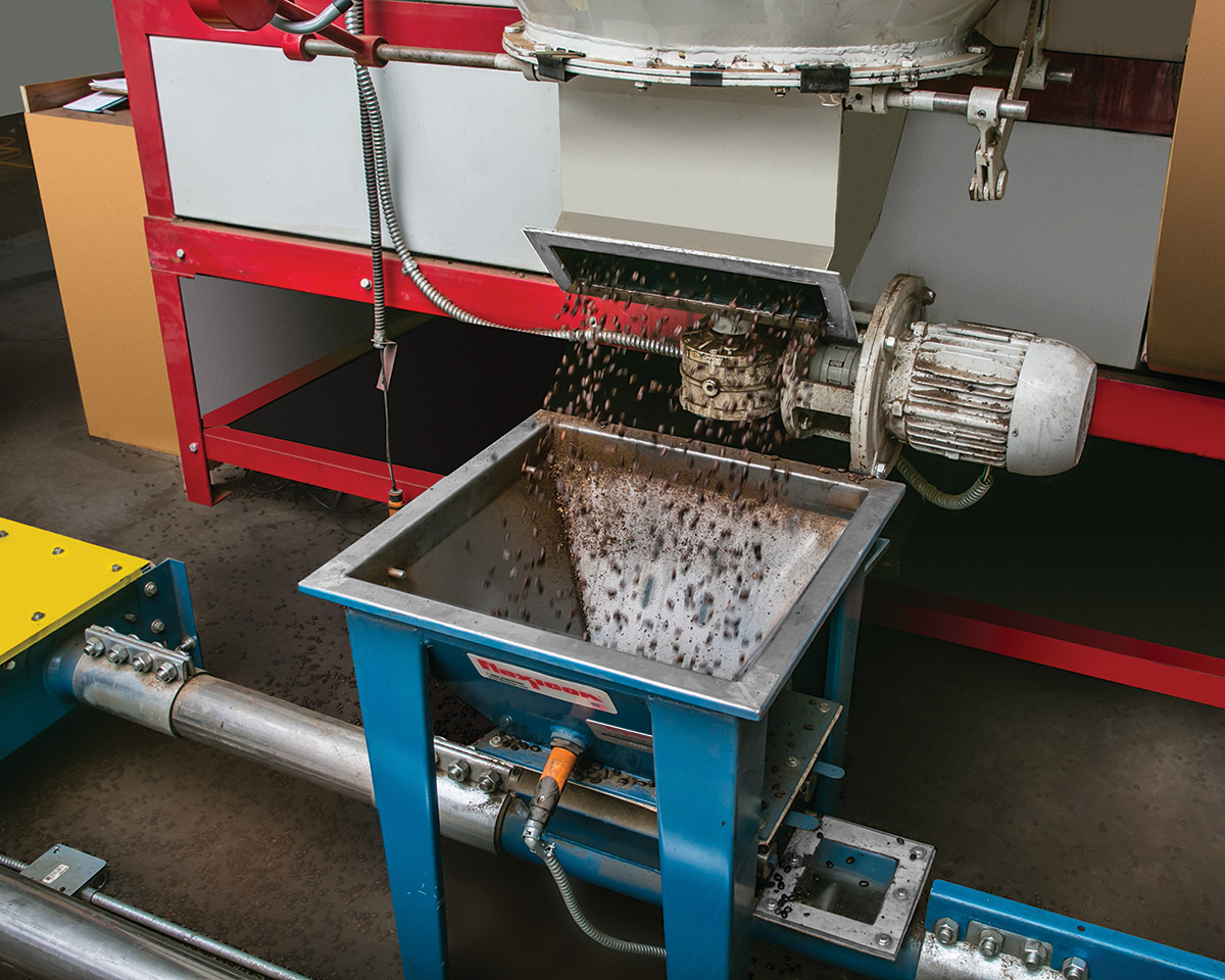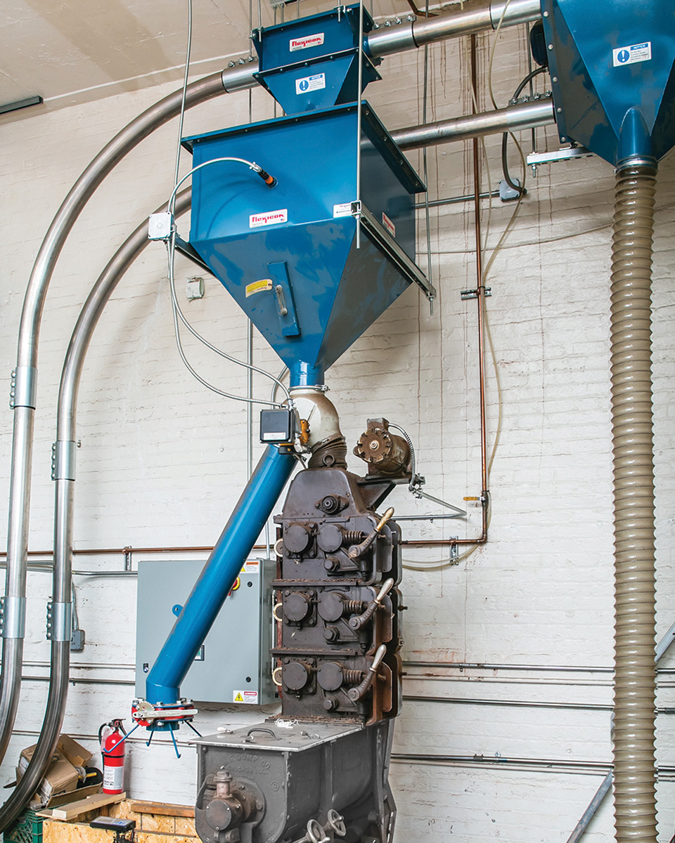 “We enter the four-bin hopper loadings on the PLC for blends. There might be 100 lb (45 kg) of beans in one compartment, 50 lb (23 kg) in another, and so on to empty into the blender,” Kasper explains. Once the correct amounts are in place, blending begins.