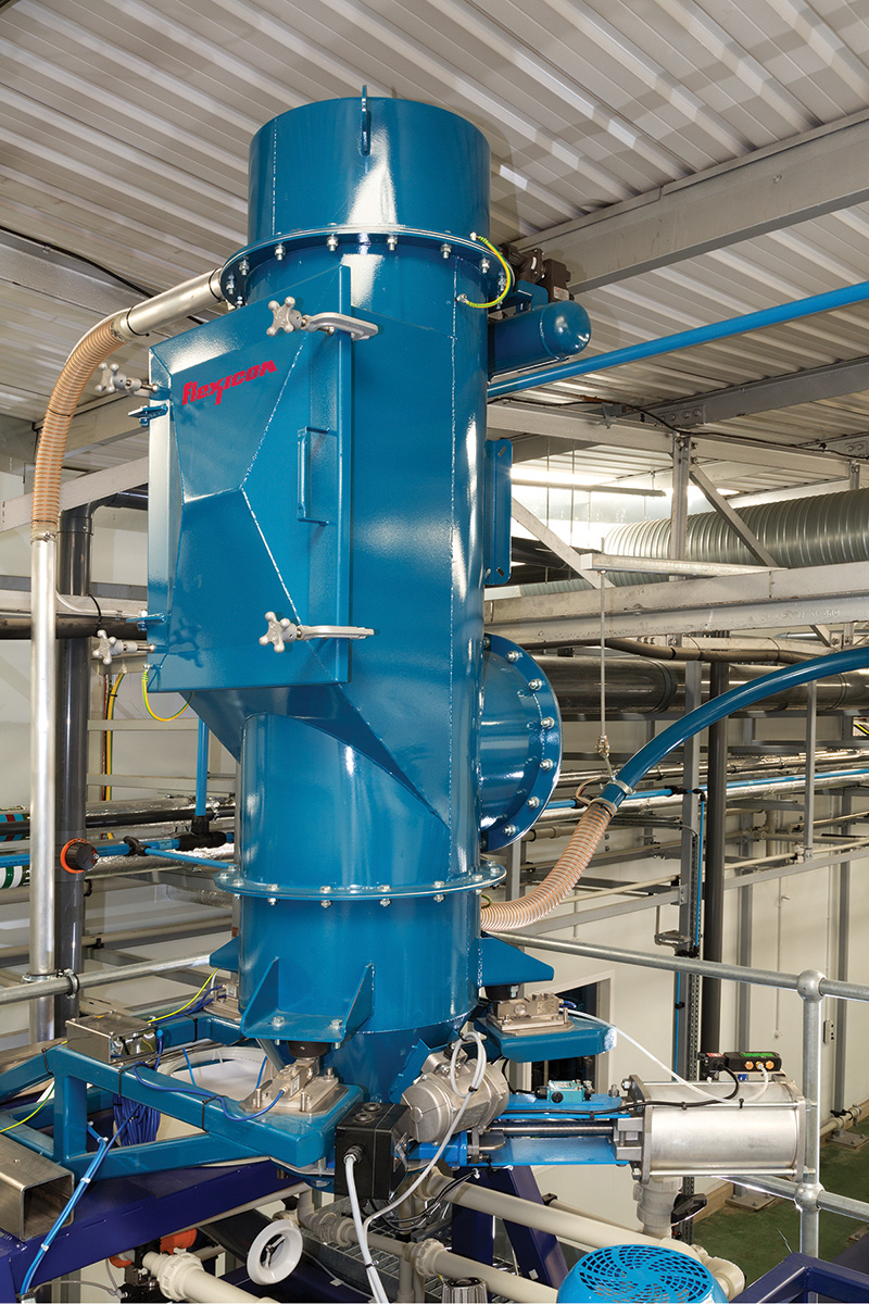 One set of load cells beneath the floor hopper at the bag dump station in combination with load cells beneath the filter receiver send signals to the PLC which automates the delivery of a predetermined amount of powder to the slurry vessel.