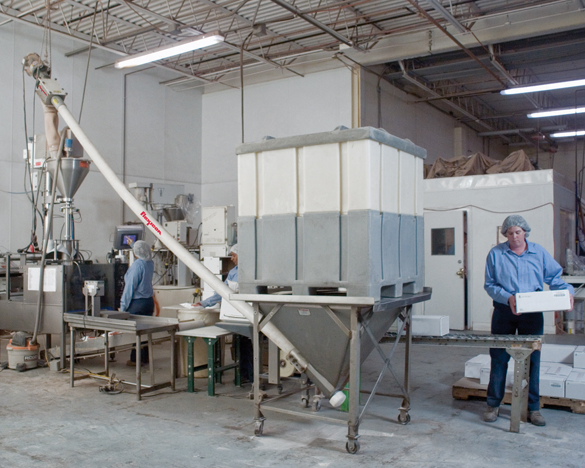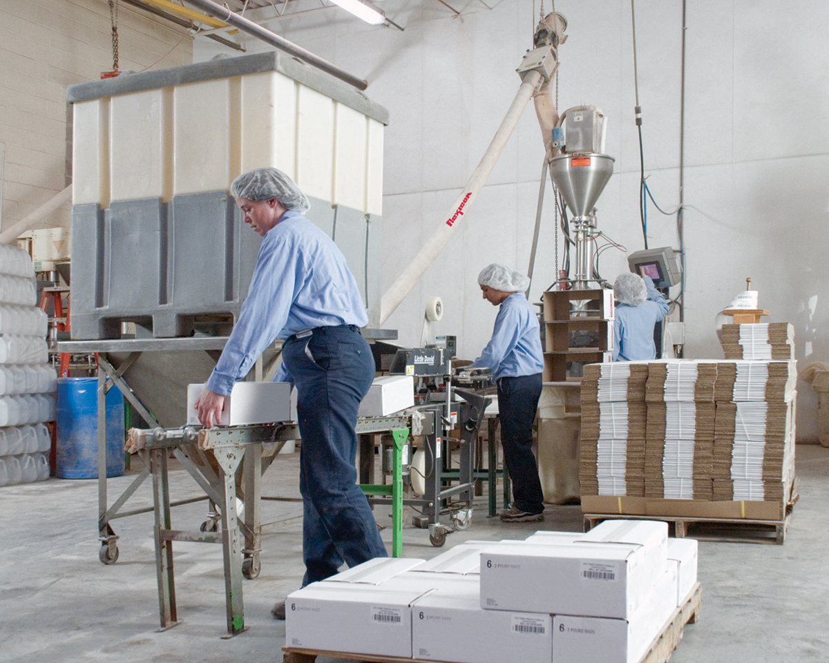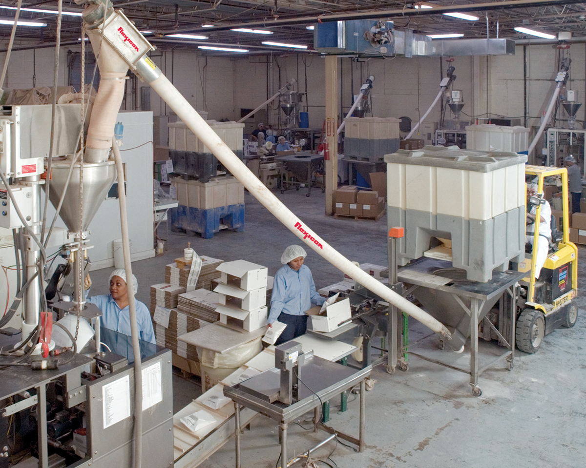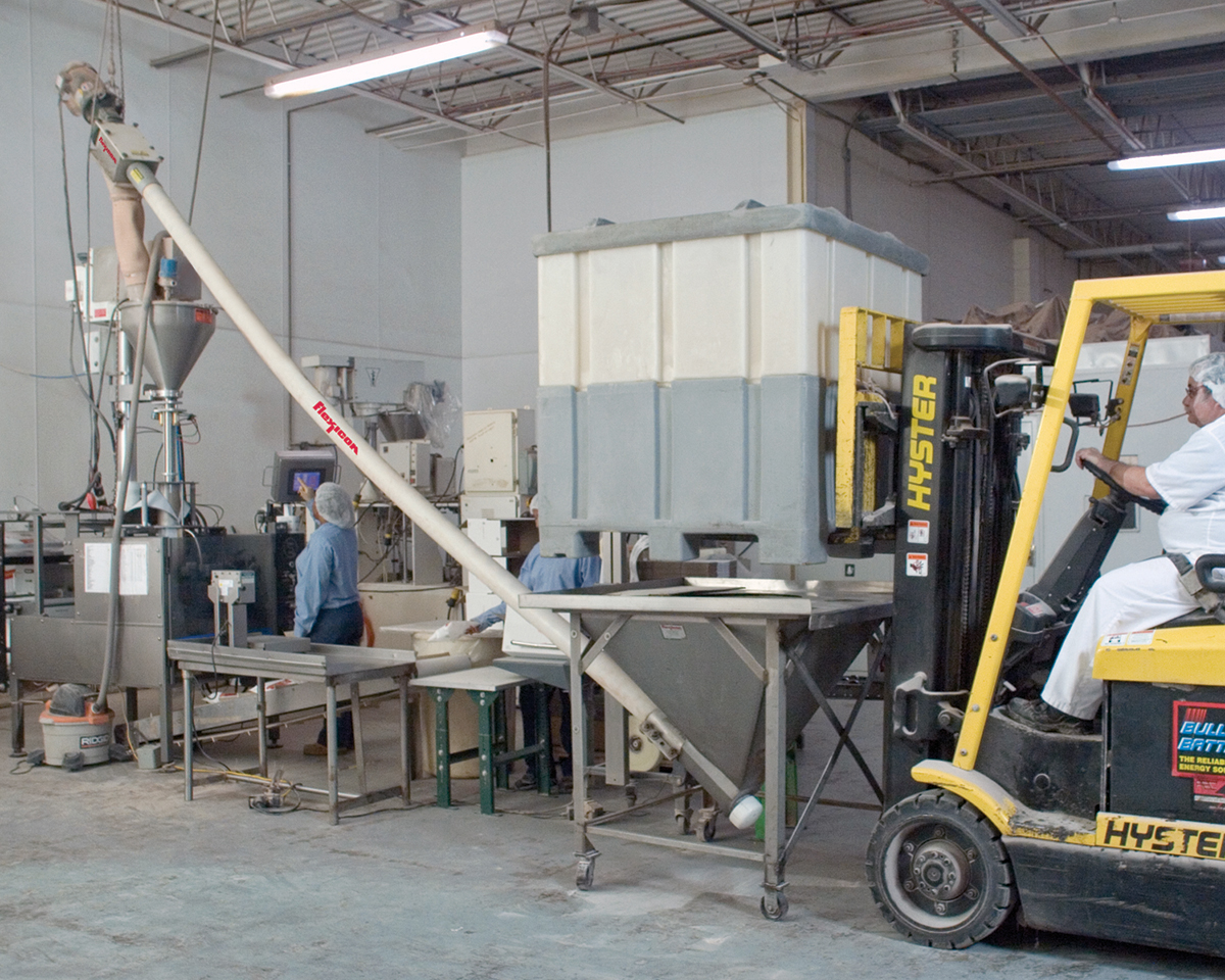 Following formulas developed by World Flavors’ R&D, workers combine ingredients, and then load each batch into one of seven blenders according to batch weight. Small batches weigh up to 300 lb (136 kg), medium batches up to 1,400 lb (635 kg), and large batches up to 8,000 lb (3,628 kg). Uniform blends are discharged from blenders into rigid-plastic, 38 in. square (96 cm2) totes that hold 1,600 lb (726 kg) of the mix. After passing quality control, workers move the totes to a holding area.
