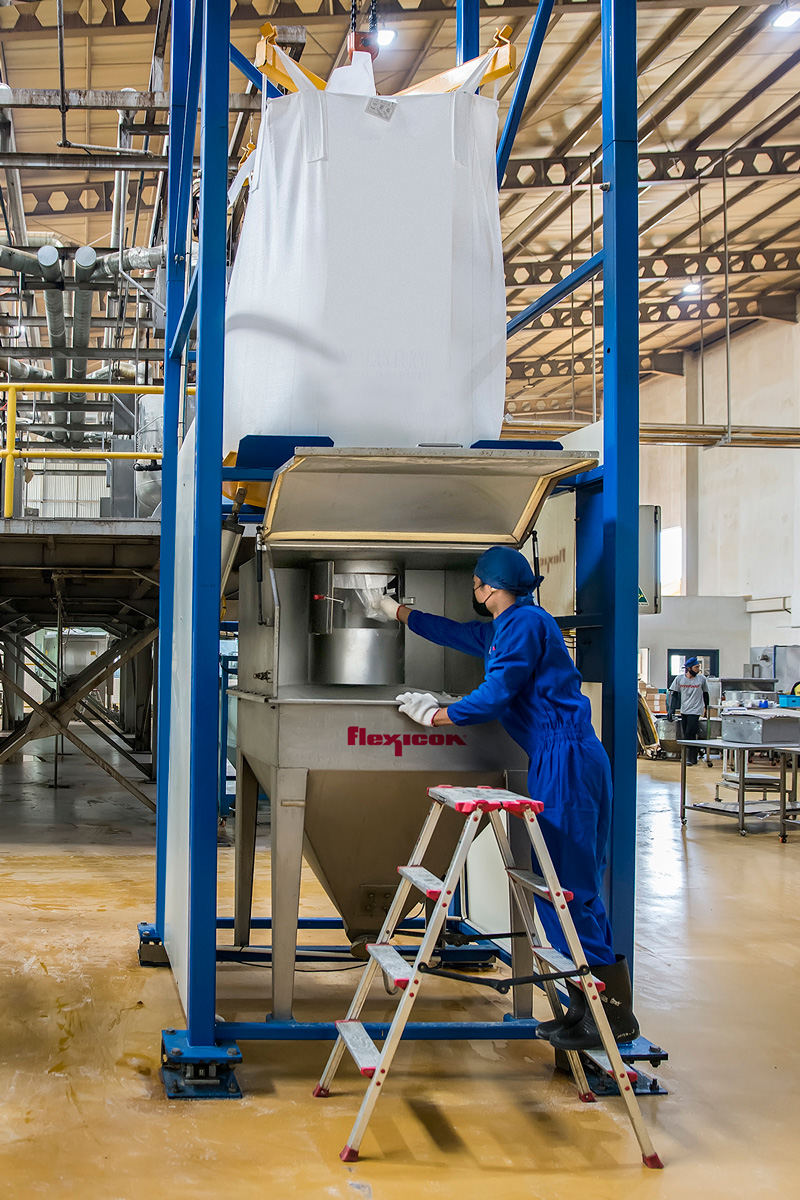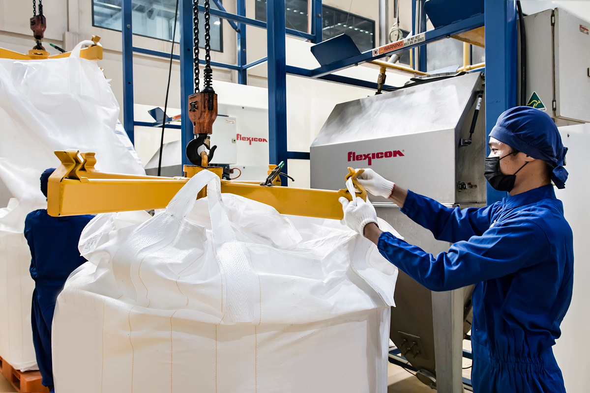 “The system eliminates heavy manual labour, helping worker well-being tremendously,” Mr. Na says. “Other benefits are accuracy, consistency, and hygiene.” The bulk bags also improve storage. “We can stack them using forklifts or put them on racks, making warehousing more efficient than with smaller bags. Flexicon gave us a turnkey solution, and it’s been working to its full capabilities.”