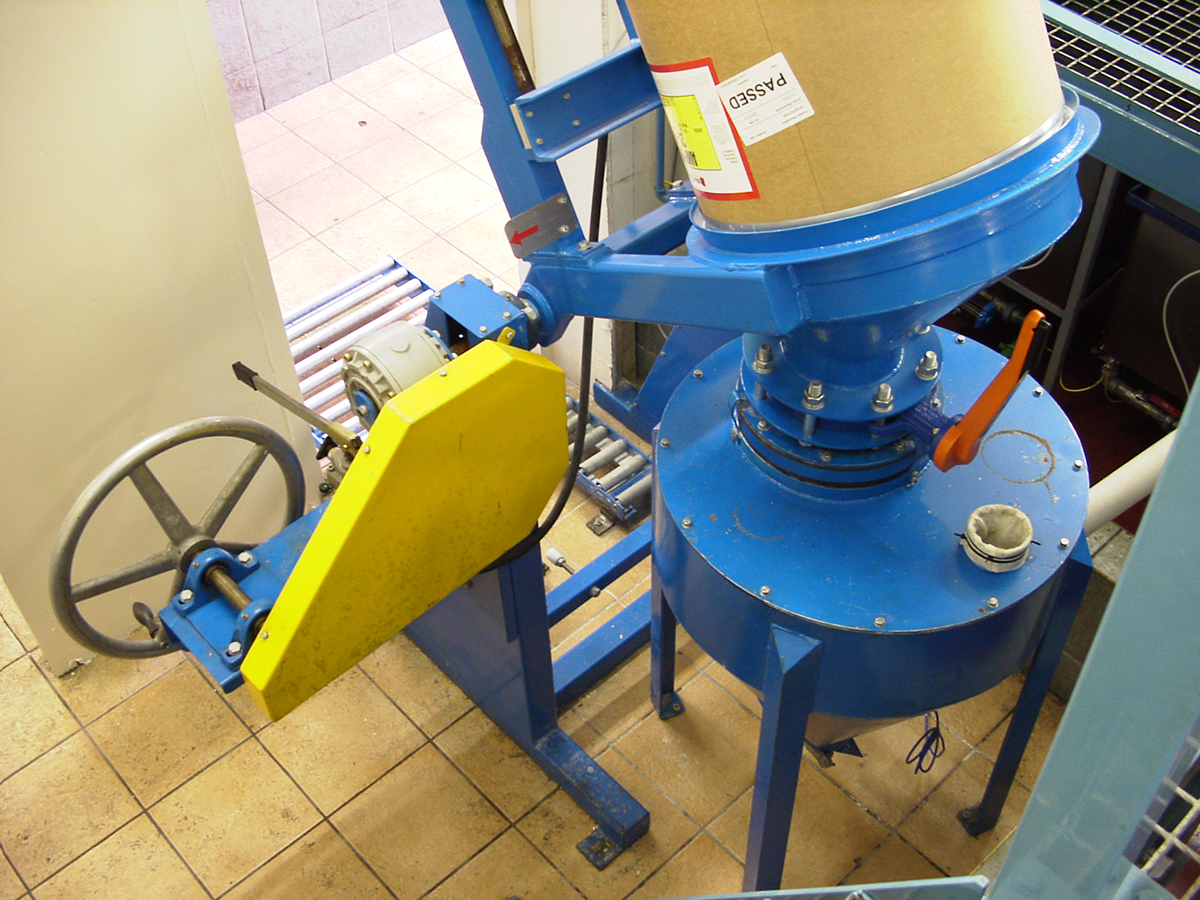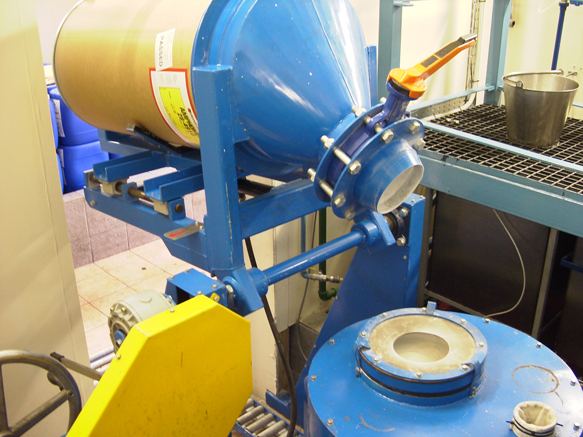 The machine raises the drum through 180 degrees until the neck of the clamping lid seats against the rubber seal on the top of the receiving hopper. The operator opens the butterfly valve in the neck of the clamping lid allowing the additive to flow into the hopper with minimal dust emission. A low-level sensor in the hopper alerts the operator of the filling status.