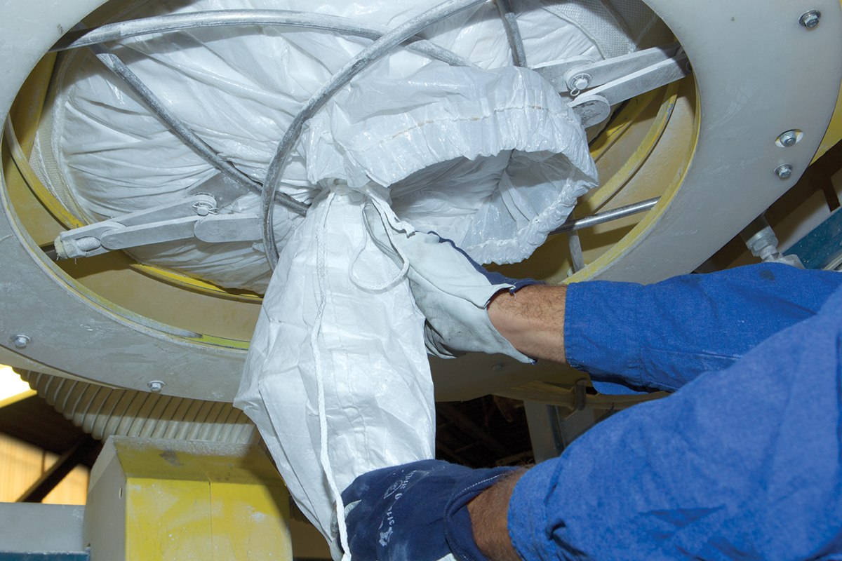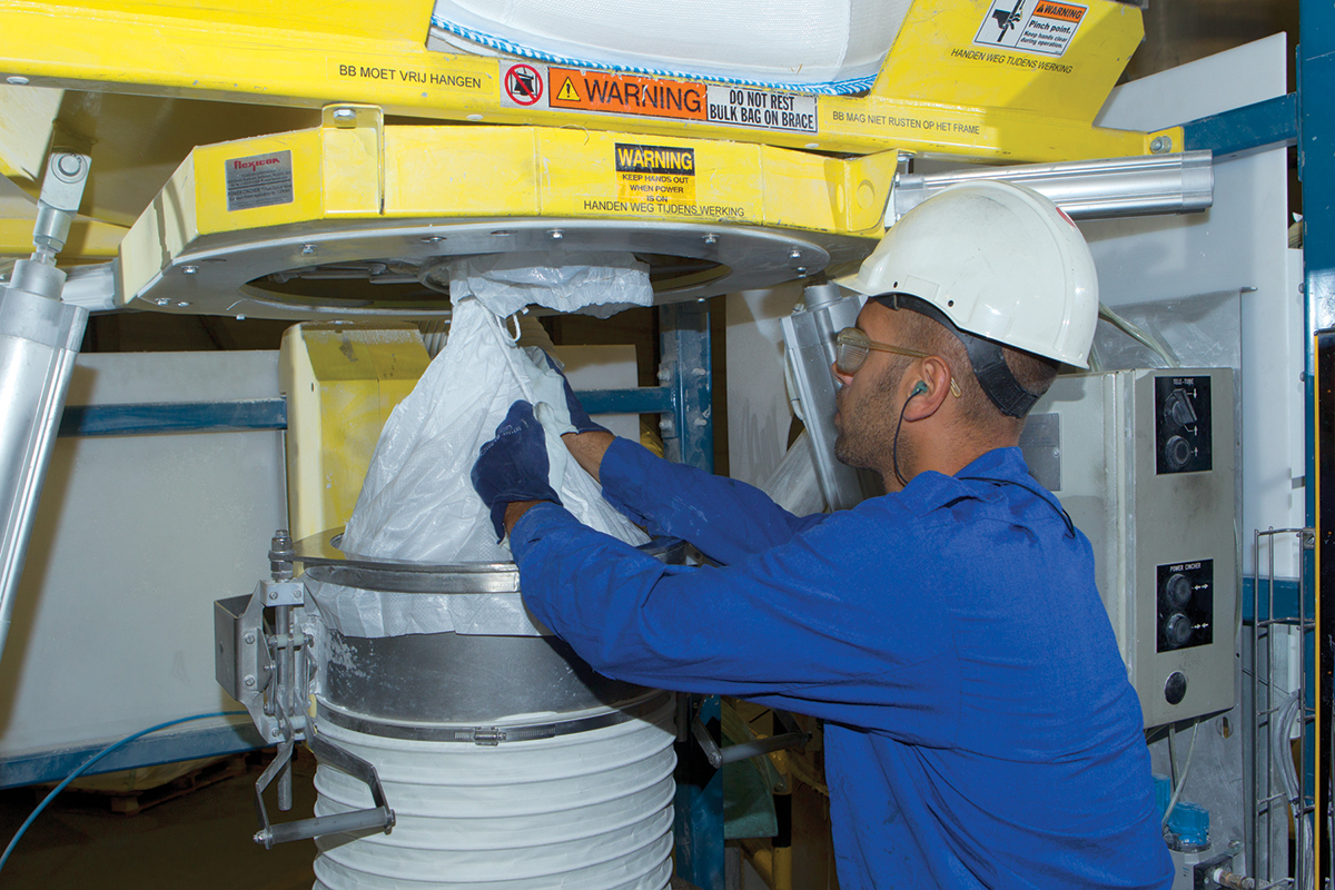 Each bulk bag weighs 1,320 lb (600 kg). Unloading a bag previously required three workers, says Drabbe. Two would mechanically hoist a bag above a hopper while a third, working from a platform atop the hopper, connected the bag to a discharge unit and dislodged trapped residue by hand. Non-free-flowing talc was especially prone to lodging in corners of the bags.