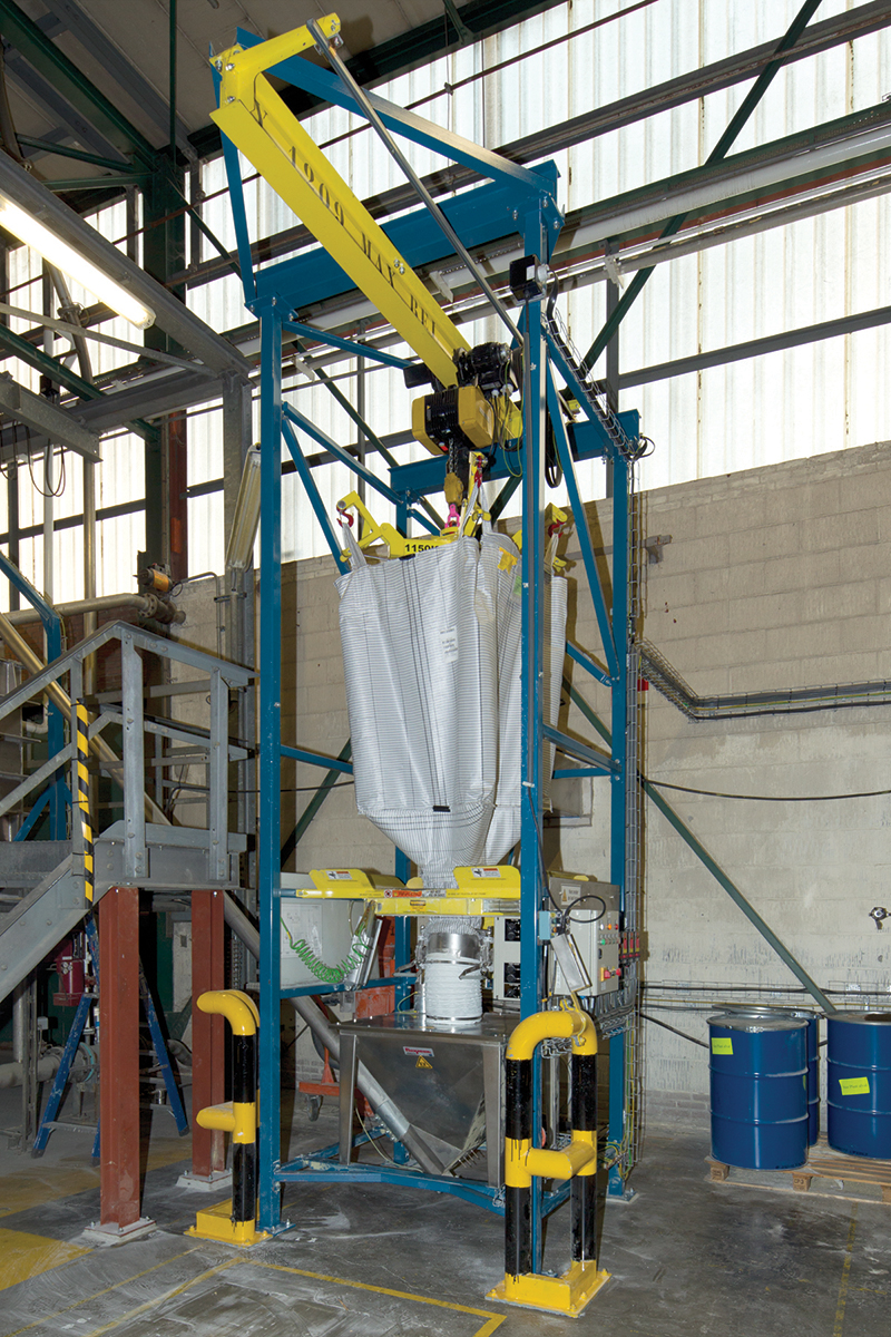 Each bulk bag discharger frame includes a cantilevered I-beam with an electric hoist and trolley, allowing a single worker to raise and position a bulk bag above the unit’s receiving hopper. Because the discharger is automatic and dust-free, Ron Drabbe says, Styron Netherlands can discharge as many bulk bags as are needed, both rapidly and safely.