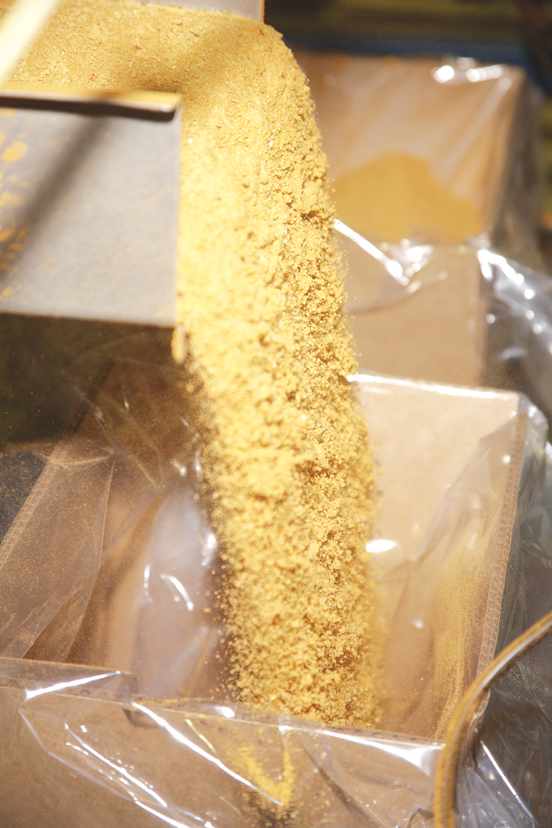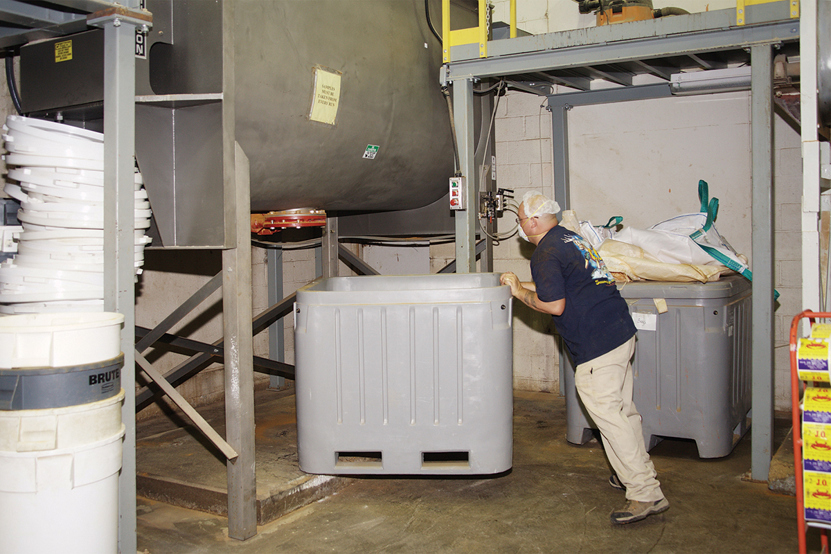 A typical batch consists of 10 to 12 ingredients (including liquid additions), depending on the product. The ingredients, mostly spices and salt, are received in 50 lb (22.7 kg) bags or boxes, which are moved by forklift onto a mezzanine and manually loaded into the mixer below.