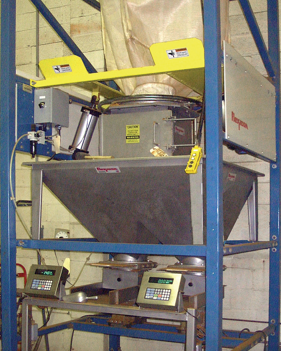 Material is discharged from the bag into a 20 ft3 (0.57 m3) hopper via an iris valve, which is opened and closed by a hand-operated wheel. The discharger is equipped with FLOW-FLEXER® bag activators that raise and lower opposing edges of the bag at timed intervals, thereby loosening compacted material and promoting material flow into the discharge spout.