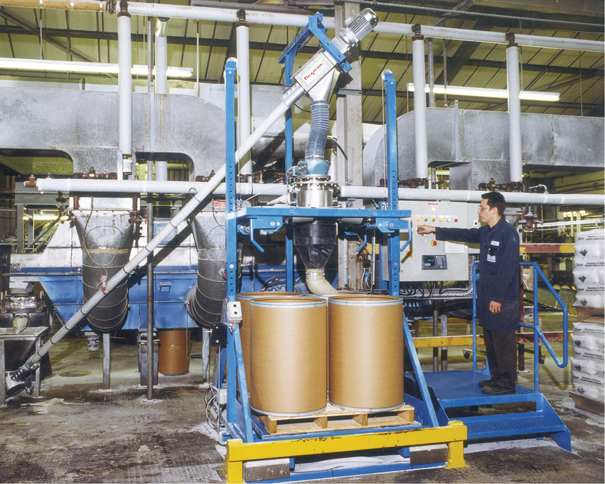 The latest bulk packaging contract required Flexicon to design a system capable of accepting polymer powders directly from the process finishing dryer and elevating it from a surge hopper to the weigh/filler. Material is safely elevated from the hopper and delivered, without damage to the bulk bag filling station via a Flexicon flexible screw conveyor, which features a self-centreing action as it rotates in the tube.