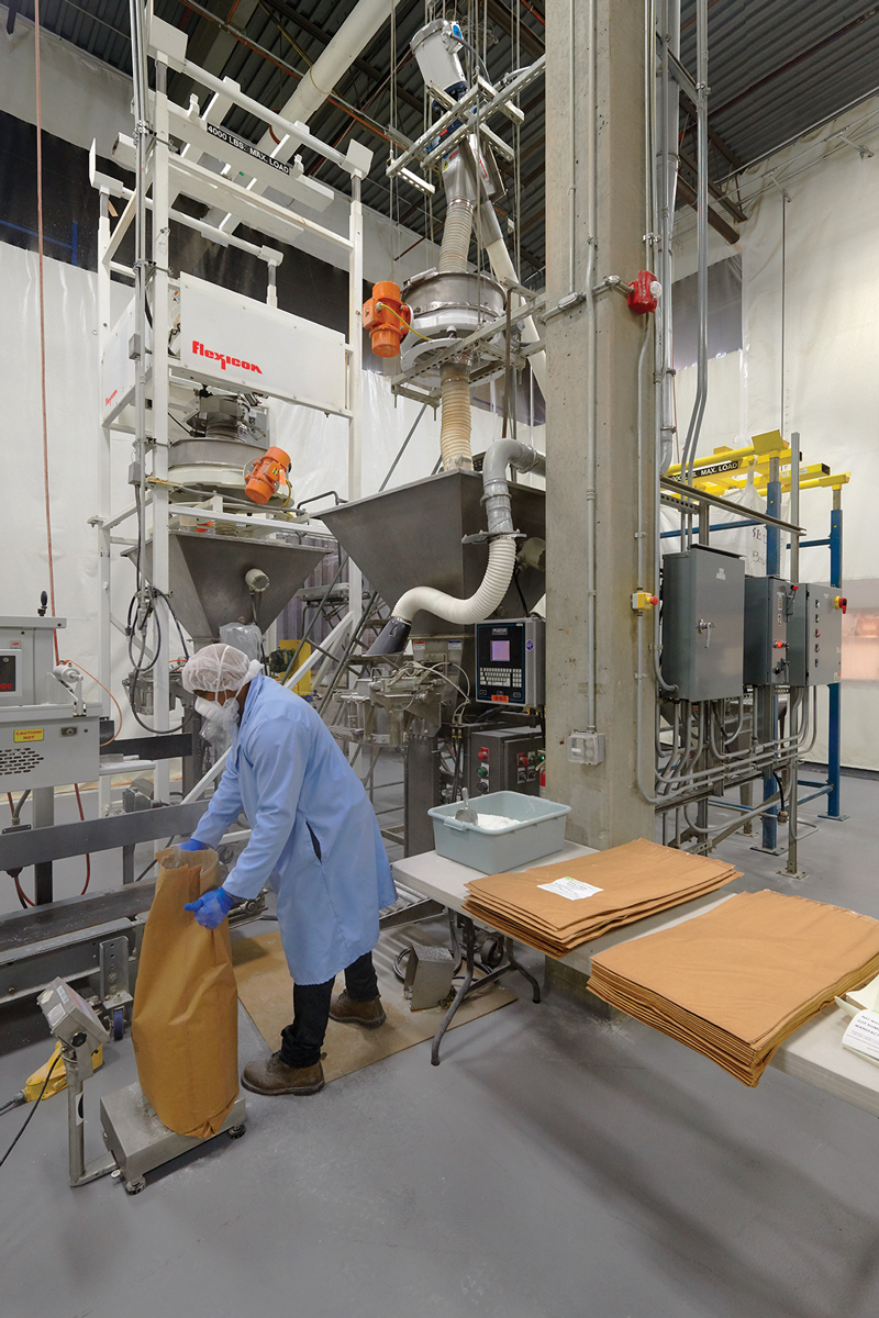 For the new space, it purchased three ribbon blenders to mix combinations of dry ingredients, including flours, sugars and fine granular products, as well as a packaging line to fill, heat-seal and palletize 50 lb (23 kg) bags or cartons.
