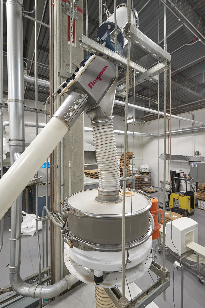 The second system incorporates the bulk bag discharger, a 24 in. (610 mm) diameter vibratory screener and a packaging machine, all stacked in a 17 ft (5.2 m) high discharger frame. The high ceiling in the process room allows this arrangement, Keating points out, minimizing footprint. A bulk bag is loaded into the discharger by forklift as with the original discharger, except the operator climbs a step ladder to access the higher bag spout connection.
