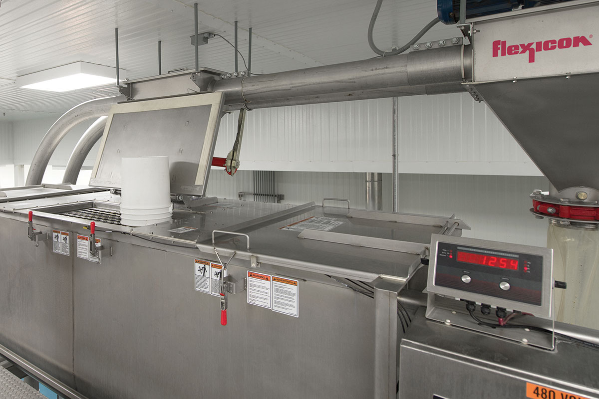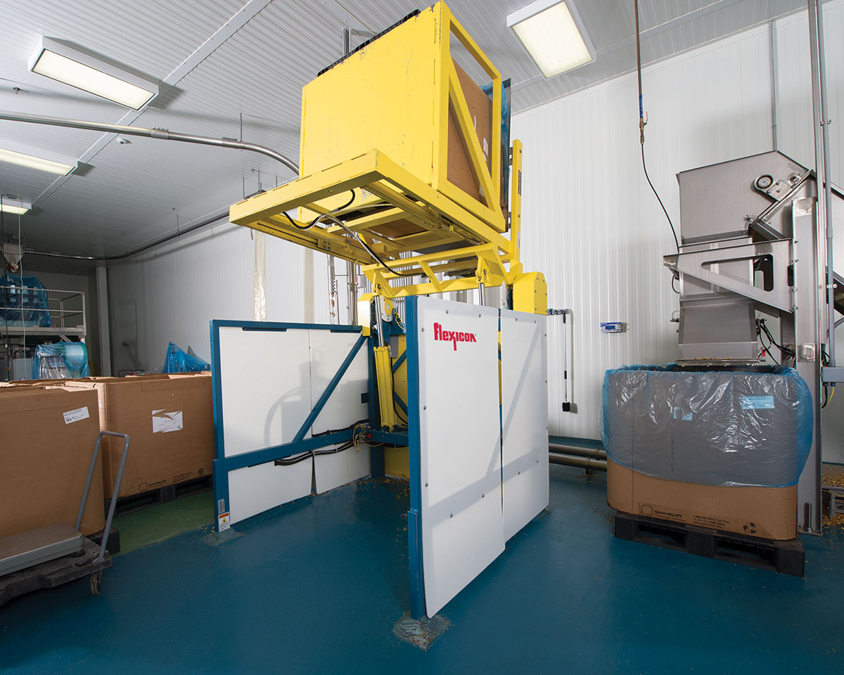The TCC discharges finished product through inline tubular discharge valves into two packaging machines equipped with level sensors that signal a PLC to maintain surge hopper fill levels by starting and stopping the conveyor. Any excess granola is discharged through the system’s drive wheel discharge adapter into open boxes, which are transported by fork truck to a Flexicon TIP-TITE® Box Dumper positioned at the intake end of the TCC. The boxes are hydraulically raised to create a dust-tight seal against a discharge hood, which is then rotated to mate with a gasketed non-metered inlet adapter of the conveyor, for re-transporting of the material to the packaging machines.