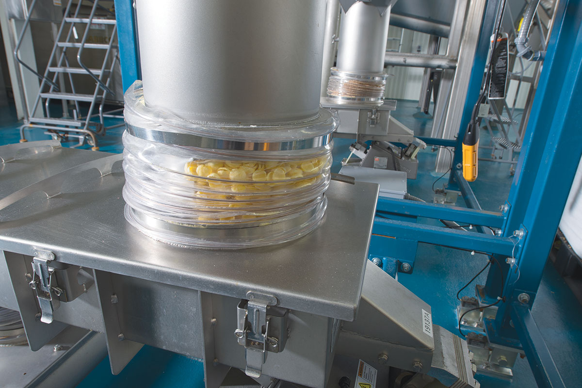 The major granola ingredients are discharged from an extruder into the Bulk Bag Filler, which is equipped with an inflatable seal and a high level sensor and indicator. Adjustable extension posts accommodate bulk bags as tall as 91 in. (2300 mm) when full — necessary because lower density materials, such as those used to produce granola, occupy more space per pound/kilogram.