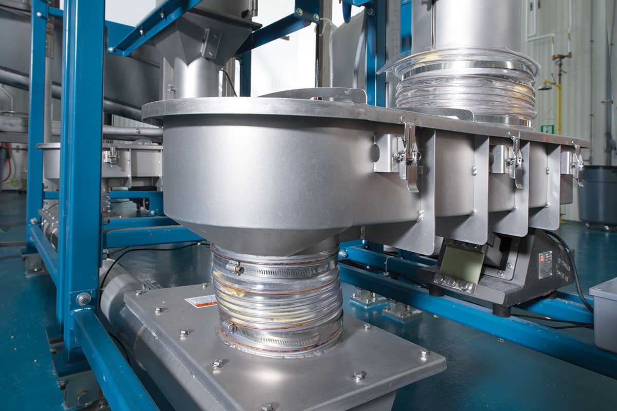 Both dischargers rest on load cells that measure weight loss and signal the vibratory feeders to stop when a pre-programmed weight has been transferred from the discharger to a mixer purchased separately by Bakery On Main.
