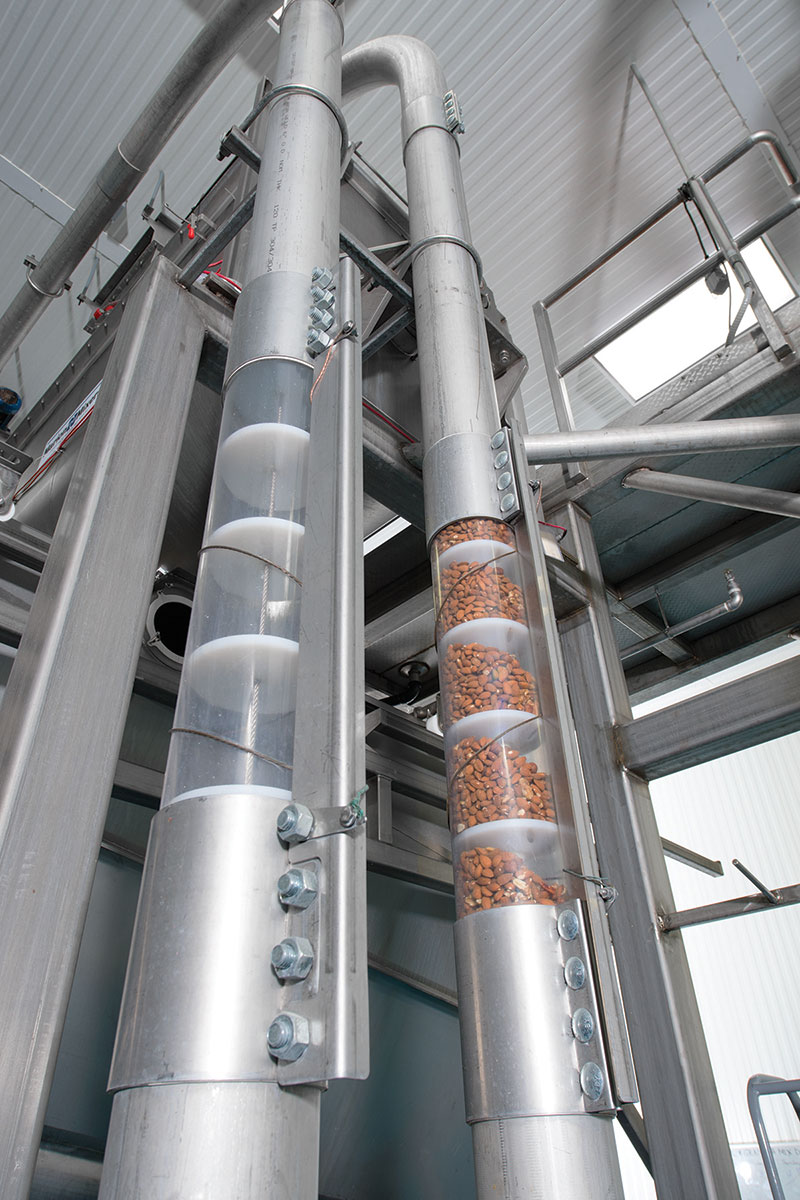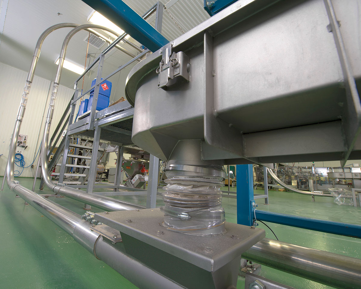 The stainless steel tubing can be positioned horizontally, vertically or at any angle. Because the system is modular, inlets and outlets can be added as needed to control the flow of material. The system can also be lengthened or shortened to fit the available space.