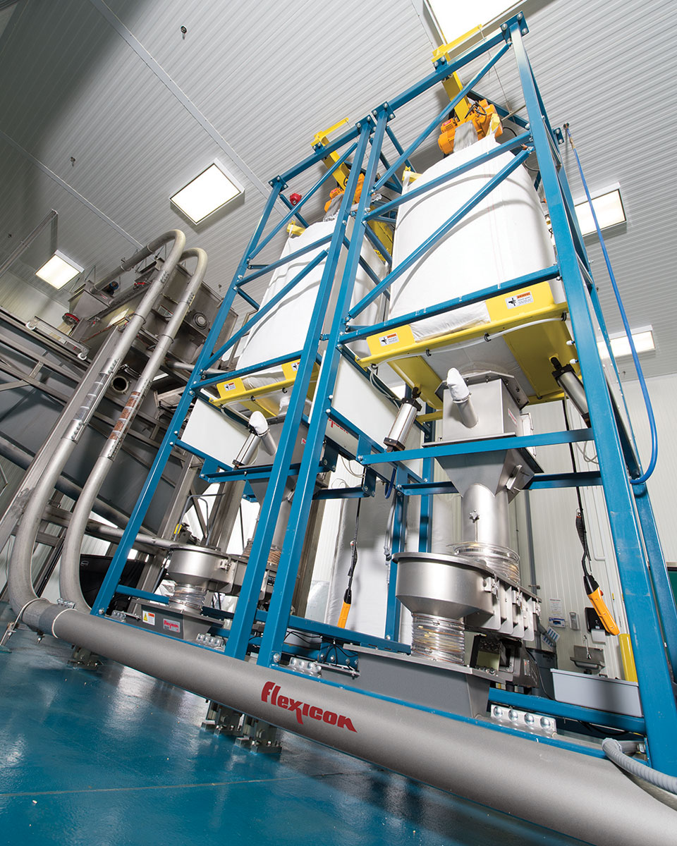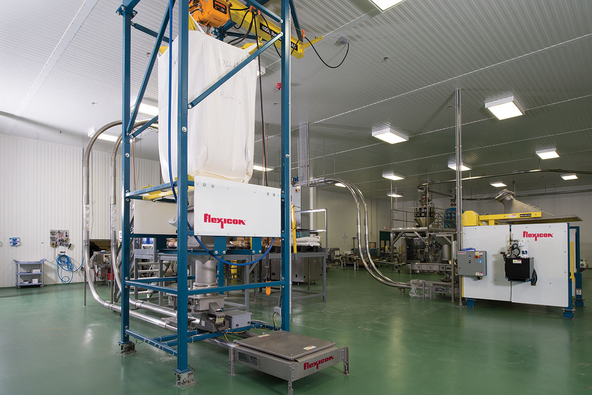The granola handling system includes two FLEXI-DISC TCC circuits, a TIP-TITE® Box Dump Station, a TWIN-CENTERPOST™ Bulk Bag Filler and two BULK-OUT® Bulk Bag Dischargers.