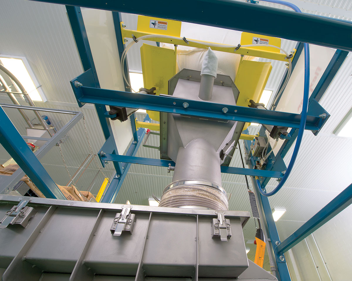 Palletized bags are then transported by forklift to a Dual Bulk Bag Discharger System which consists of two identical BULK-OUT® BFC Series Dischargers, each with a cantilevered I-beam, electric hoist and trolley for loading and unloading bulk bags.