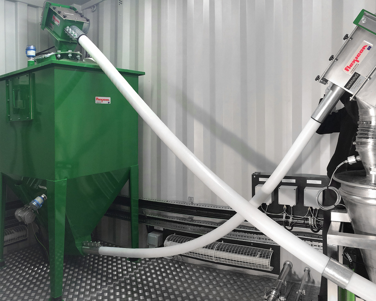 From the BFF-C-X Bulk-Out™ split-frame bulk bag discharger, PAC is automatically transferred from a half tonne bulk bag through a flexible screw conveyor to a surge hopper from which a second flexible screw conveyor meters the powder into the ejector.