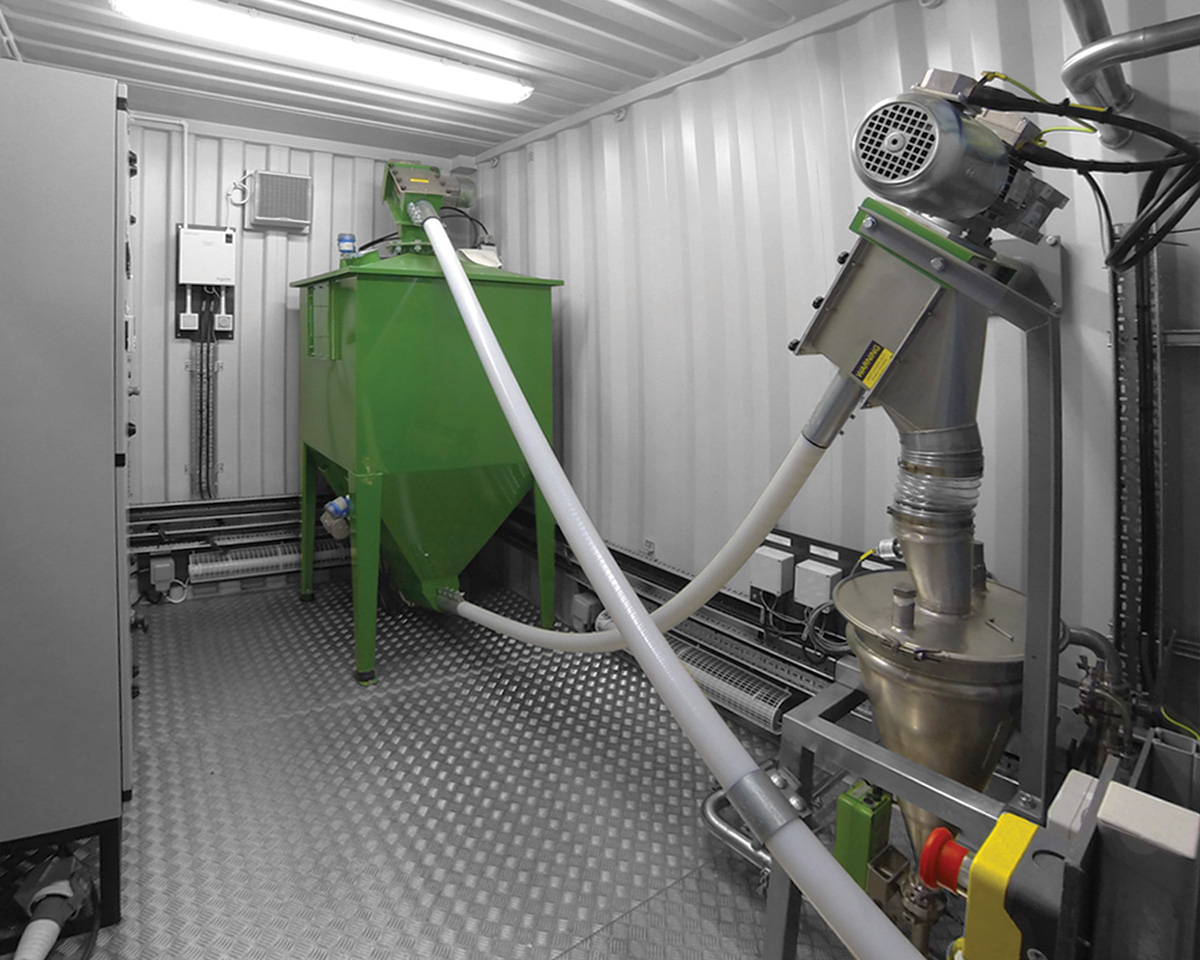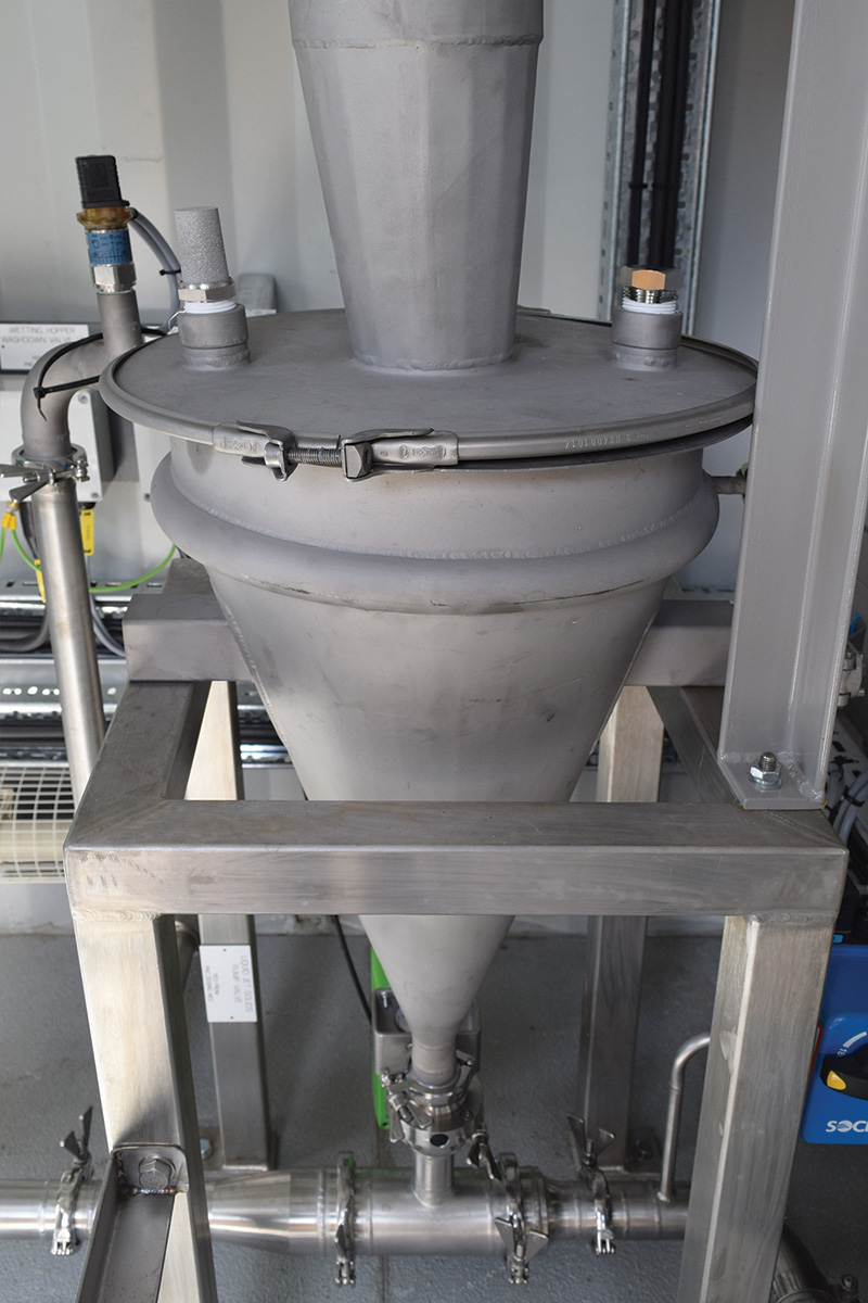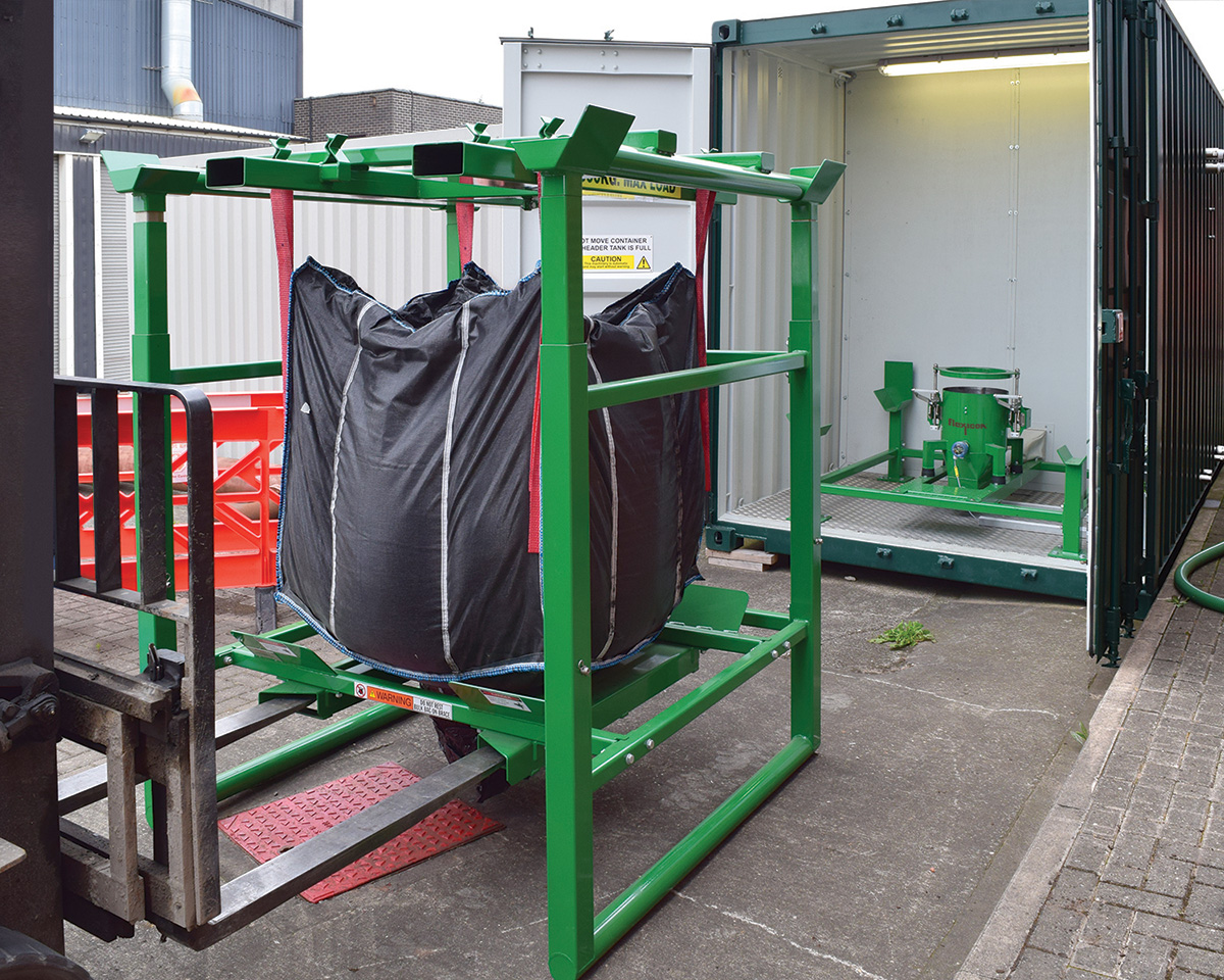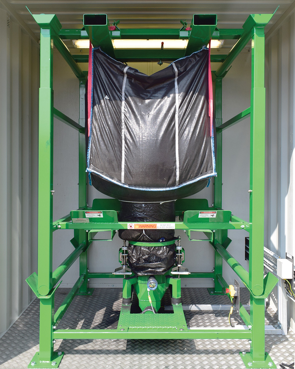 A forklift loads the 1.8 m (5.9 ft) high bag-loading frame and 500 kg (1100 lb) bulk bag onto the 0.9 m (3 ft) high stationary discharger frame inside the shipping container. Once the bag spout is untied, the powder flows into a 5 m (16.5 ft) long, 80 mm (3 in.) diameter flexible screw conveyor leading to the 930 l (33 ft3) capacity surge hopper. A second 3.5 m (12 ft) long, 67 mm (2.5 in.) diameter flexible screw conveyor moves the carbon powder from the hopper outlet to the intake of the ejector that accurately doses the PAC into the municipal water stream.