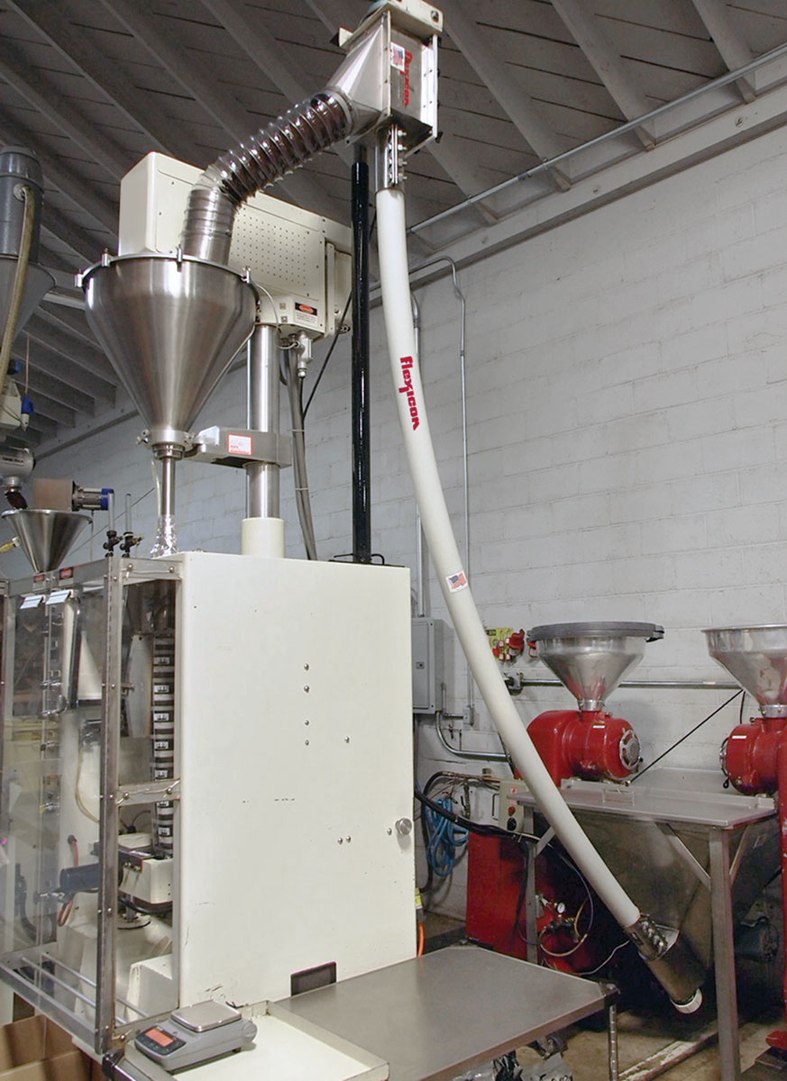 Despite its age and lack of modern controls, the flexible screw conveyor continues to reliably and automatically deliver ground coffee to the filling machine, for a quarter-century of productivity for Mr. Espresso.